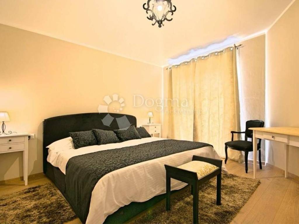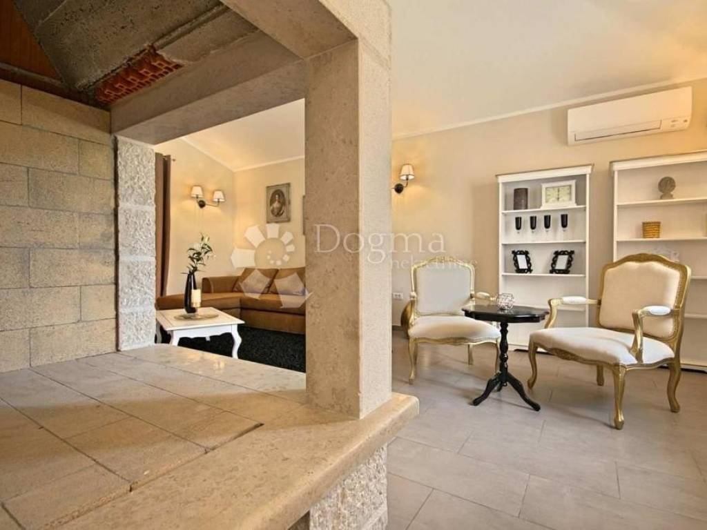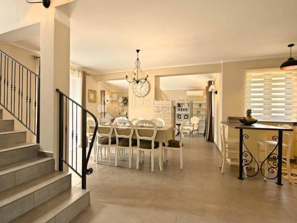 On the ground floor there is a spacious living room with a fireplace and leather furniture with access to the pool beach, then one bedroom with a bathroom and access to the terrace, a guest toilet, a fully equipped elegant kitchen with a dining area.