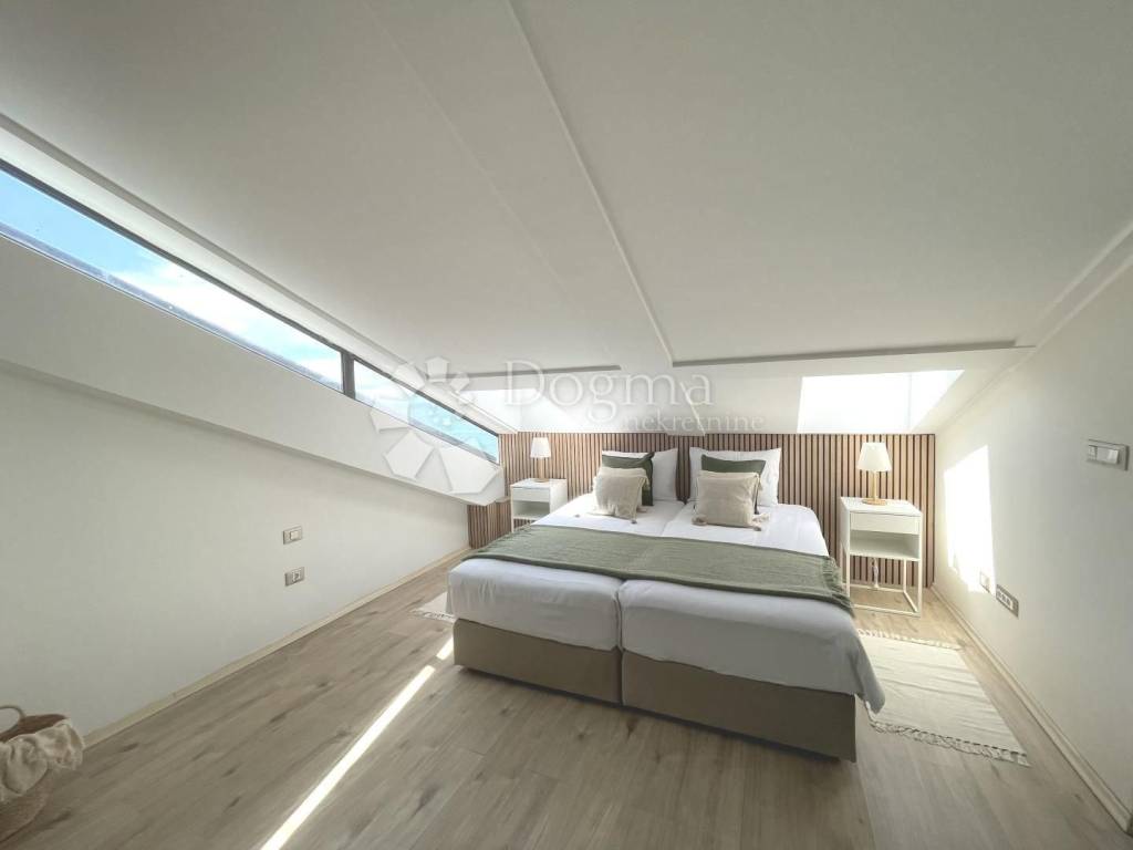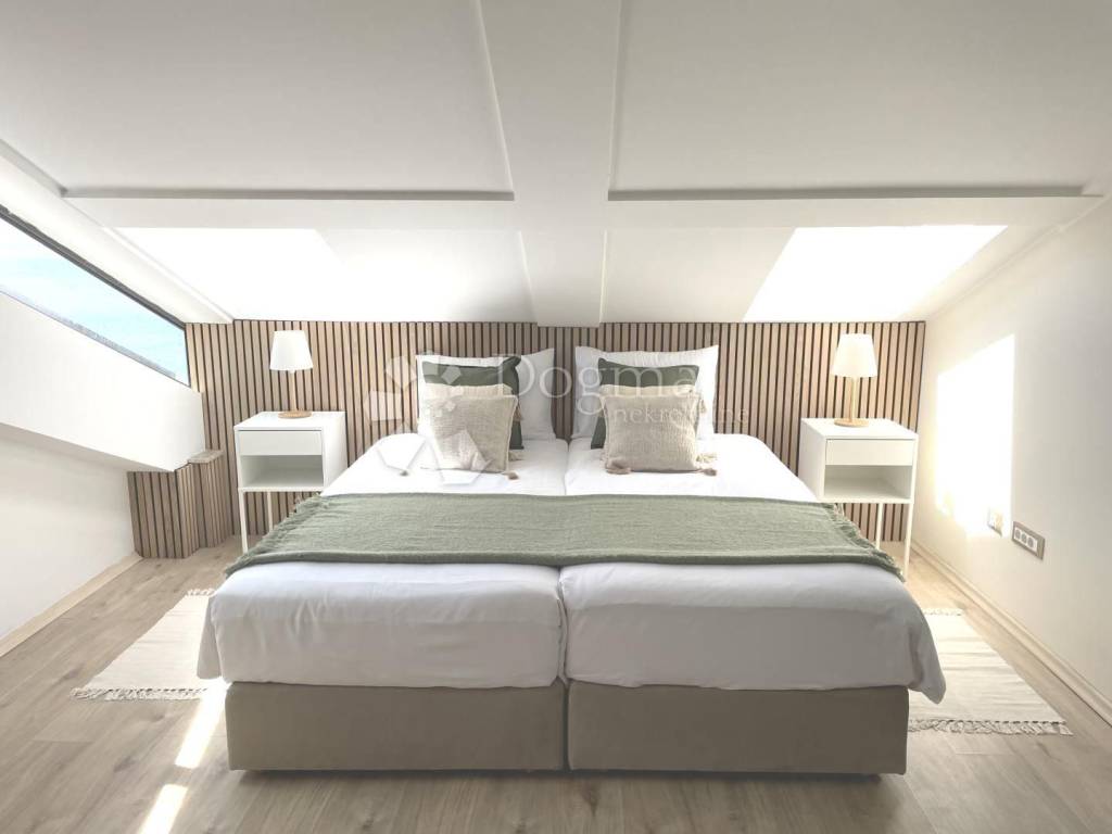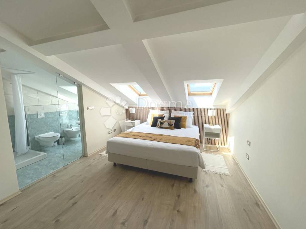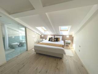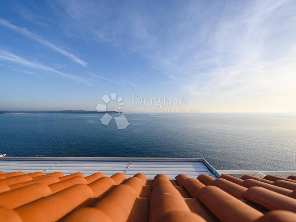In the very heart of a beautiful town and only 30 meters from the sea, there is this spacious penthouse that covers an area of 285m2. The penthouse is located on the fifth floor of a residential building, and has a separate entrance and elevator. The apartment consists of 3 bedrooms, 3 bathrooms, a hallway, and a spacious living room and kitchen. The apartment has two parking spaces.