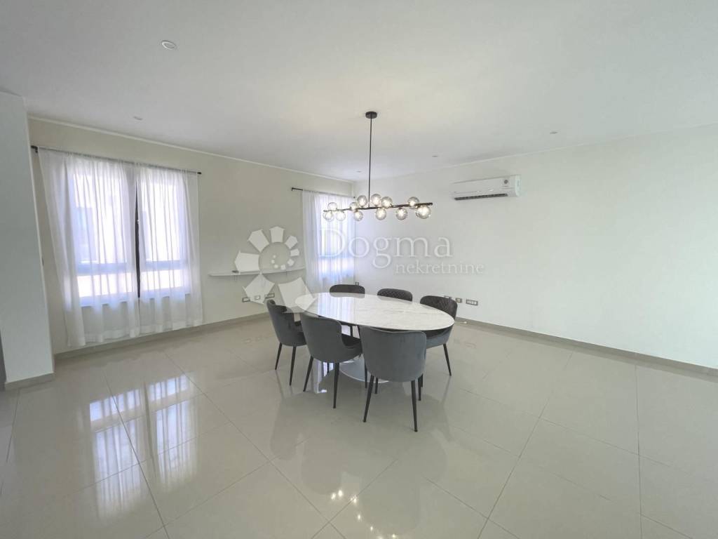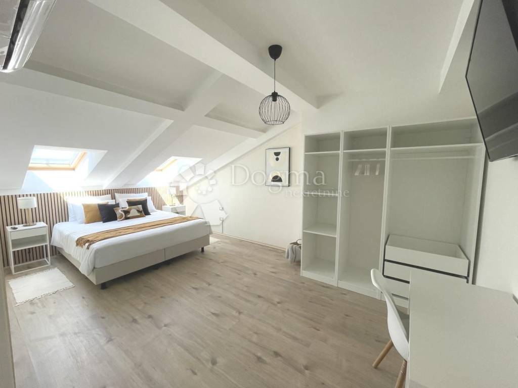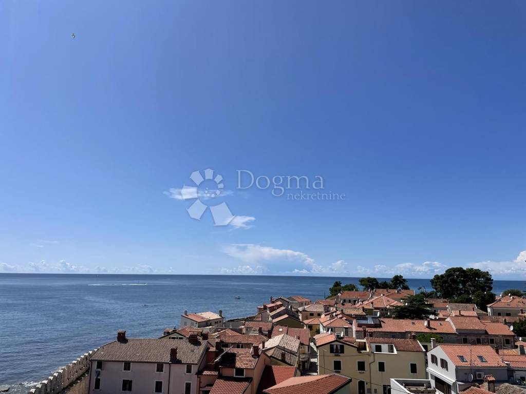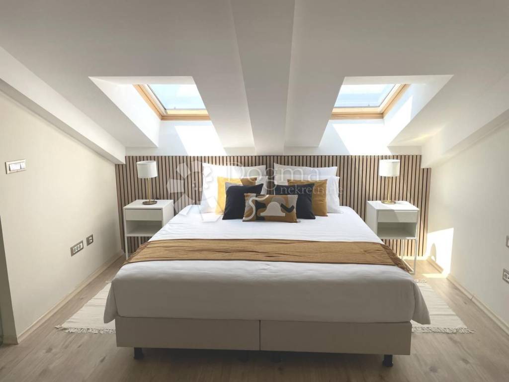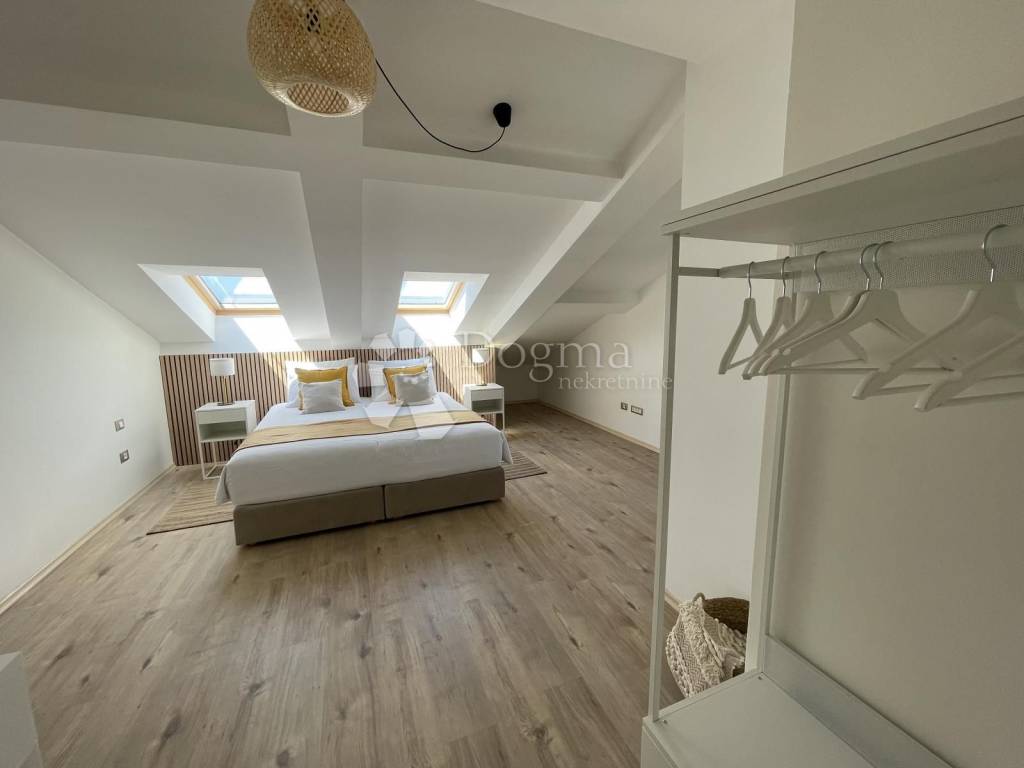 In the very heart of a beautiful town and only 30 meters from the sea, there is this spacious penthouse that covers an area of 285m2. The penthouse is located on the fifth floor of a residential building, and has a separate entrance and elevator. The apartment consists of 3 bedrooms, 3 bathrooms, a hallway, and a spacious living room and kitchen. The apartment has two parking spaces.