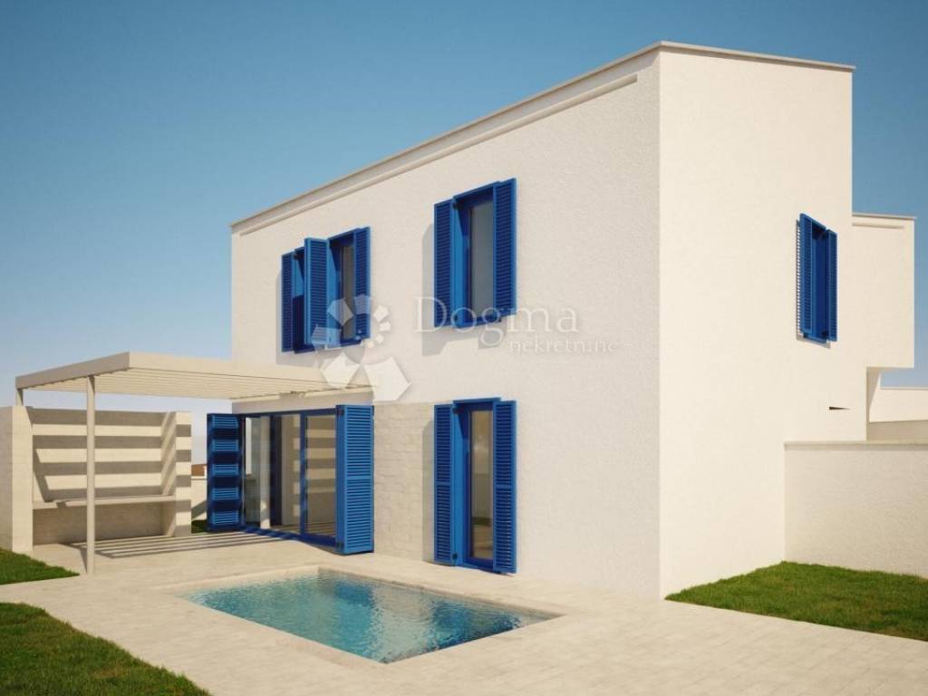 Each unit consists of a ground floor (hallway, toilet, open space kitchen, dining room and living room with access to a covered terrace with an outdoor kitchen and a landscaped garden where there is a swimming pool and sun deck) and a first floor with an internal staircase (three bedrooms, two bathrooms, one of which is a master bedroom with a bathroom and a balcony with a view of the sea).