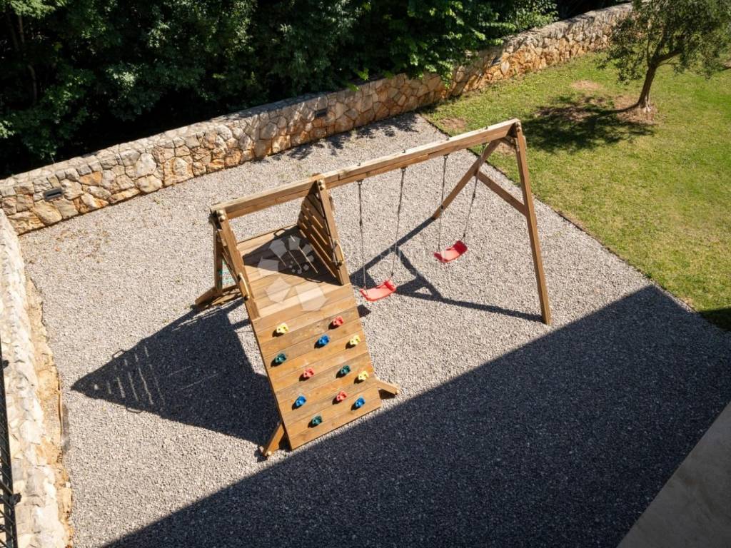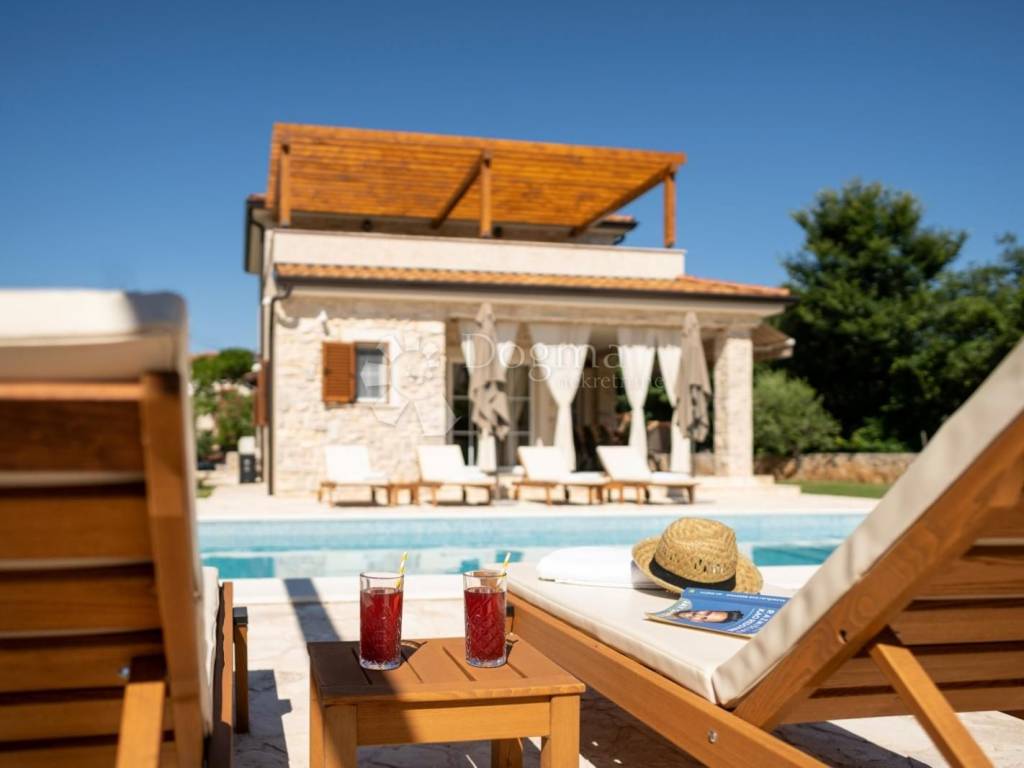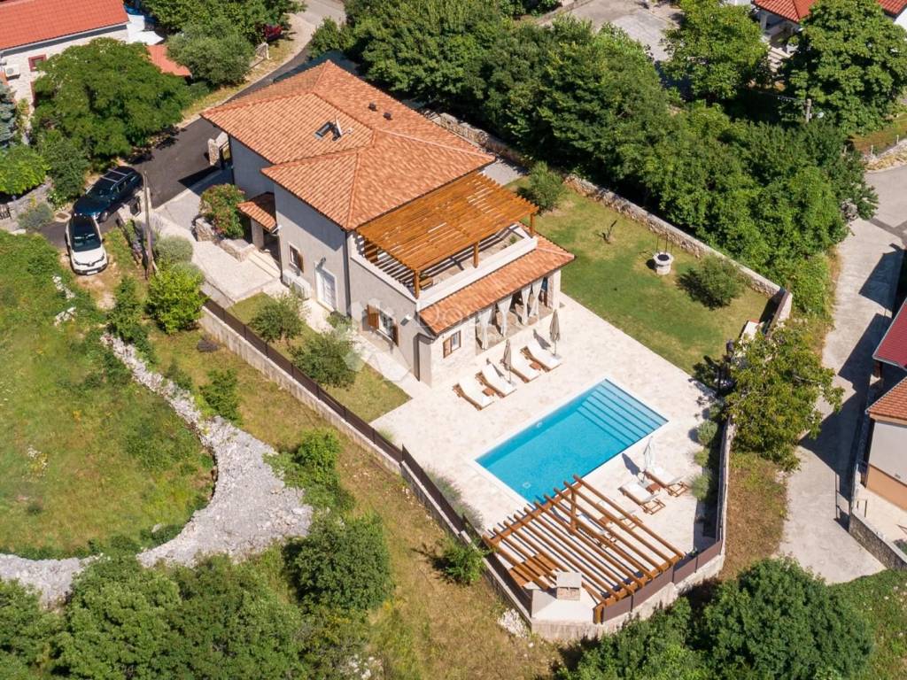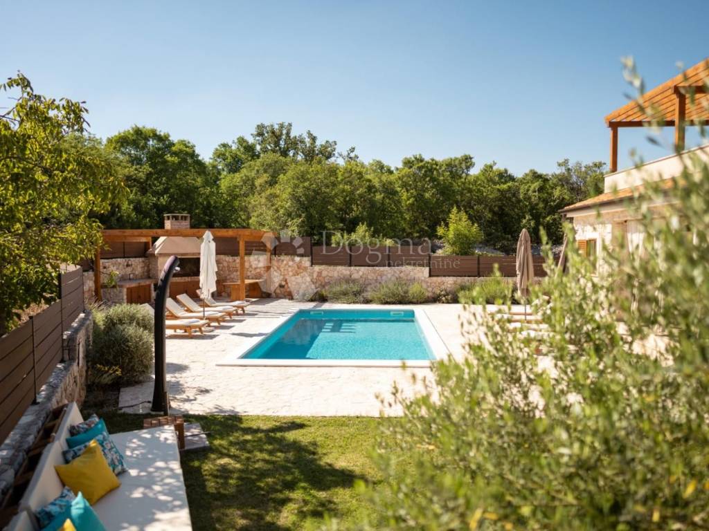 We are selling a very beautiful newly built stone autochthonous villa with a large heated pool in the area of the municipality of Dobrinj. It is very well built in the Mediterranean style, where stone and wood predominate, as well as the most modern quality materials. Very well architecturally designed and divided into two floors with a total of four bedrooms with attached bathrooms, toilet, open living room with kitchen and dining room and terraces. Underfloor heating and built-in air conditioners extend your stay from the summer to the winter season. Beautifully designed garden with a large swimming pool of 36m2, sunbathing area, children's playground, barbecue, automatic irrigation of green areas and covered parking for 5 cars. Great house for living, vacation and investment.