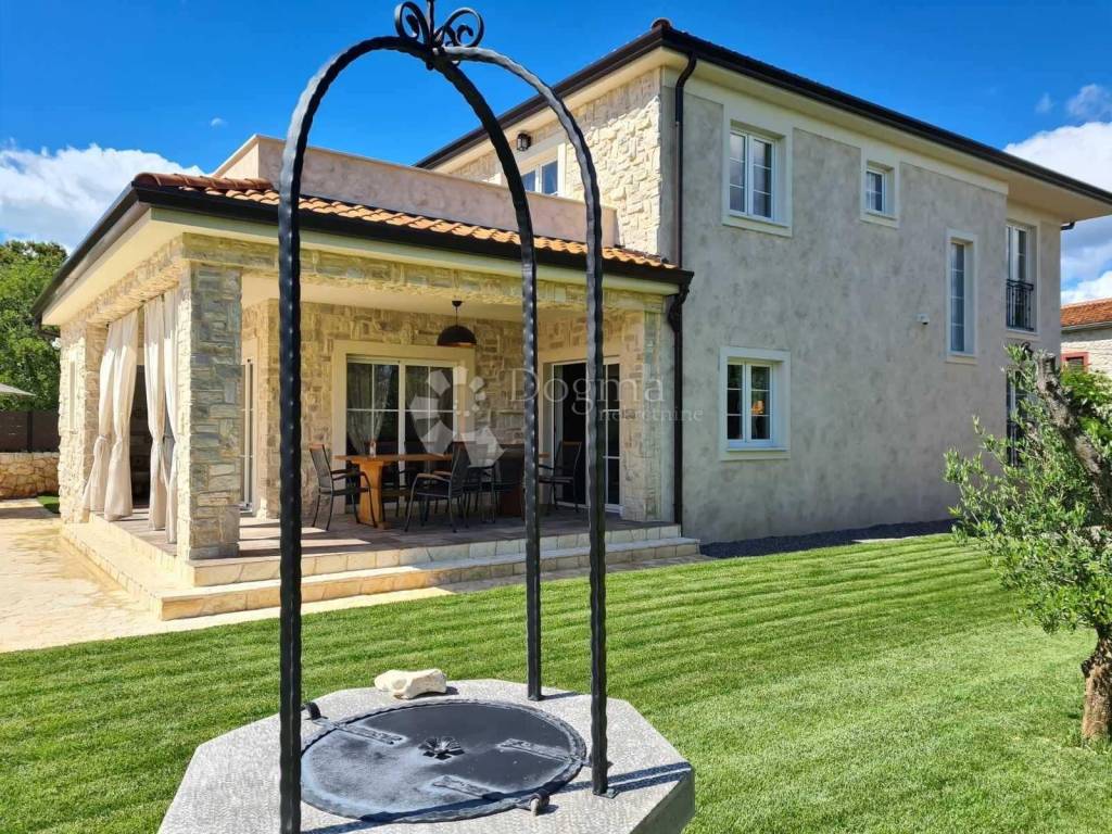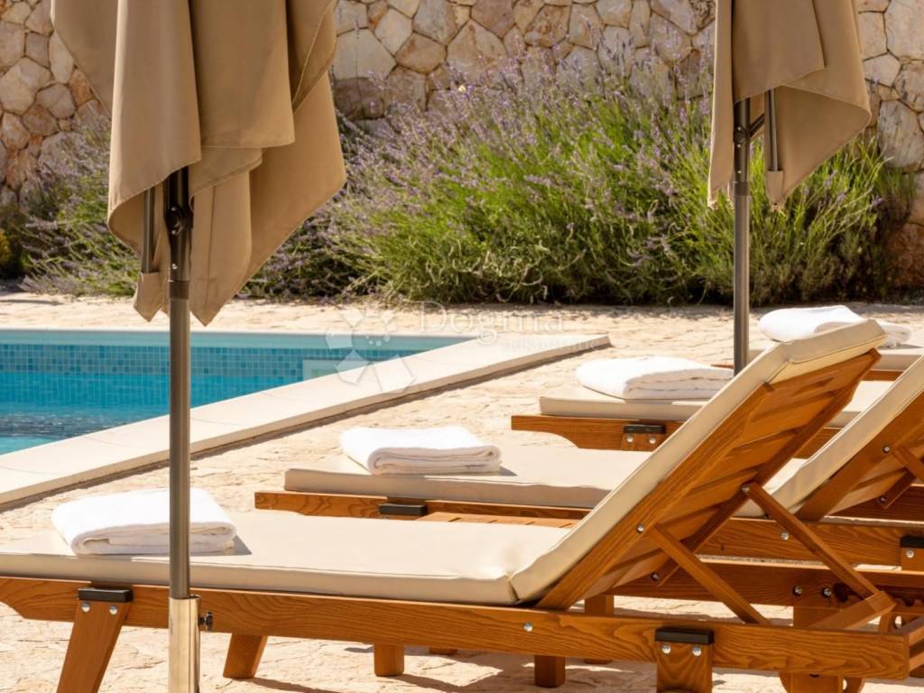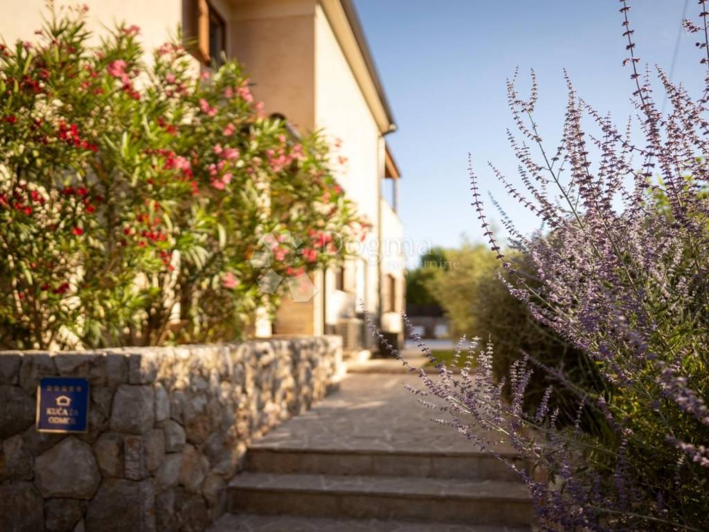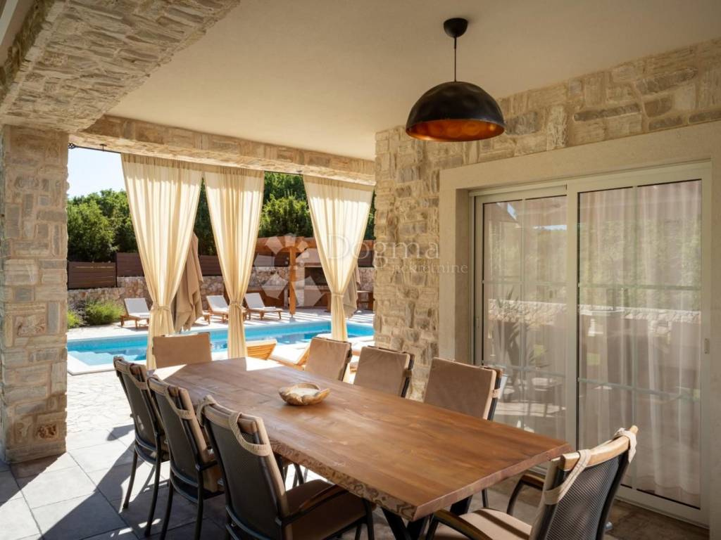 We are selling a very beautiful newly built stone autochthonous villa with a large heated pool in the area of the municipality of Dobrinj. It is very well built in the Mediterranean style, where stone and wood predominate, as well as the most modern quality materials. Very well architecturally designed and divided into two floors with a total of four bedrooms with attached bathrooms, toilet, open living room with kitchen and dining room and terraces. Underfloor heating and built-in air conditioners extend your stay from the summer to the winter season. Beautifully designed garden with a large swimming pool of 36m2, sunbathing area, children's playground, barbecue, automatic irrigation of green areas and covered parking for 5 cars. Great house for living, vacation and investment.