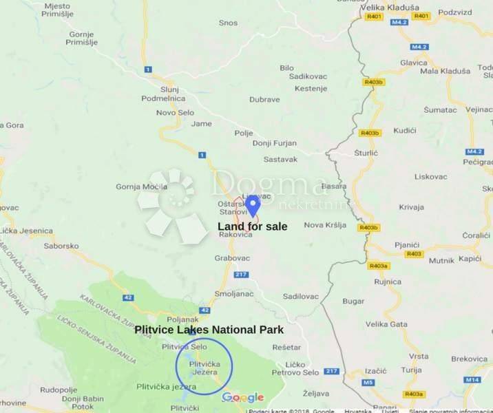47.262 m zemljišta od čega 17.516 m u T1 zoni (hotel s dodatnim sadržajima) a ostatak 29.746 m je poljoprivredno zemljište koje se može iskoristiti za dodatne sadržaje ili prenamijeniti u budućnosti. Zemljište se nalazi 15 km od ulaza 1 u Nacionalni park Plitvička jezera, 17 km od Rastoka u Slunju, 13 km od Baraćevih špilja. U blizini (1,3 km udaljen) nalazi se adrenalinski park. Ranč Dolina Jelena nalazi se 11 km od zemljišta, dok su rančevi za jahanje (Terra i Equus Igni) udaljeni oko 8 km.