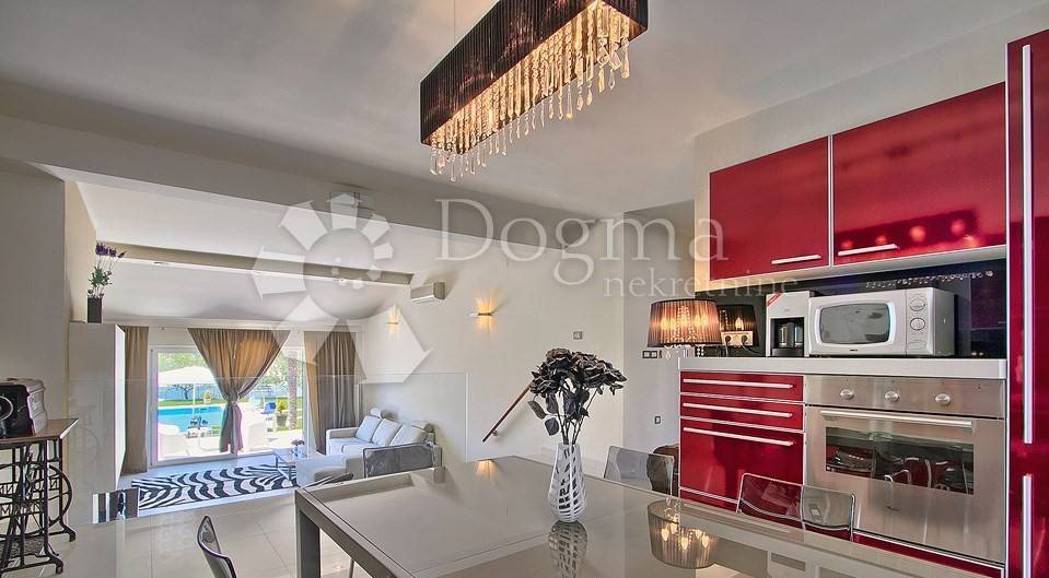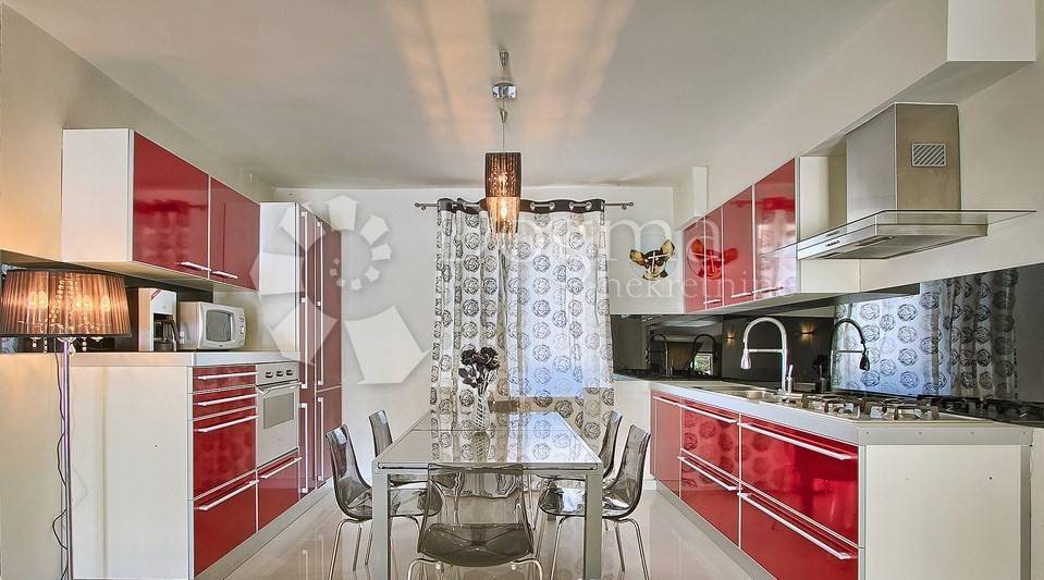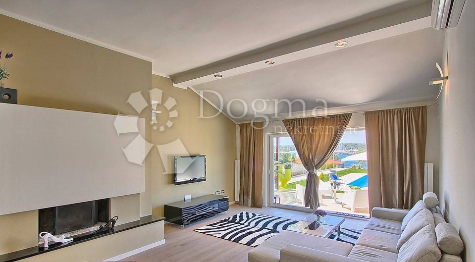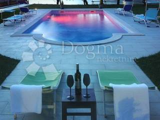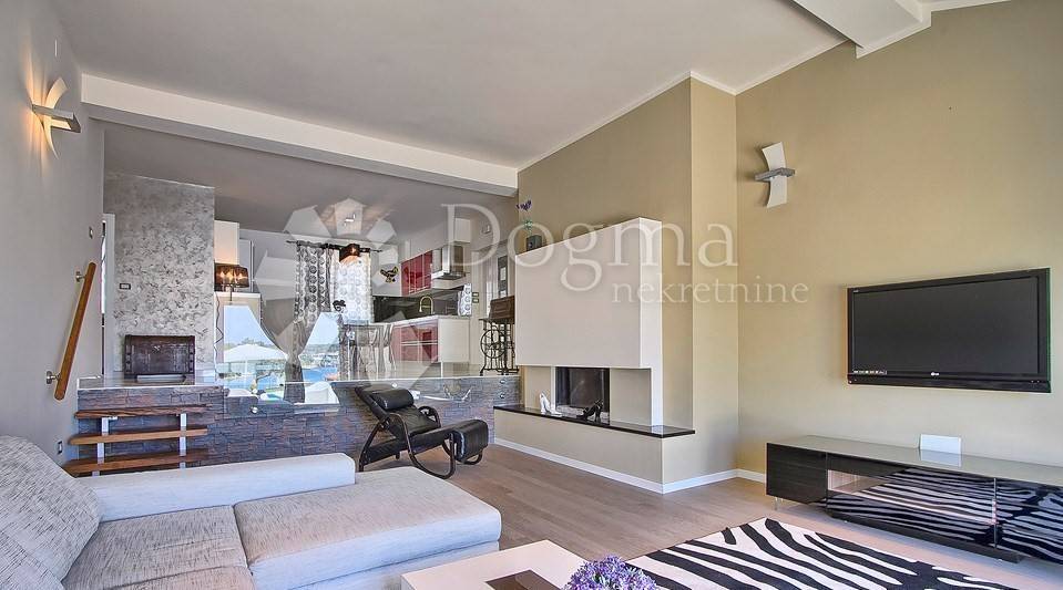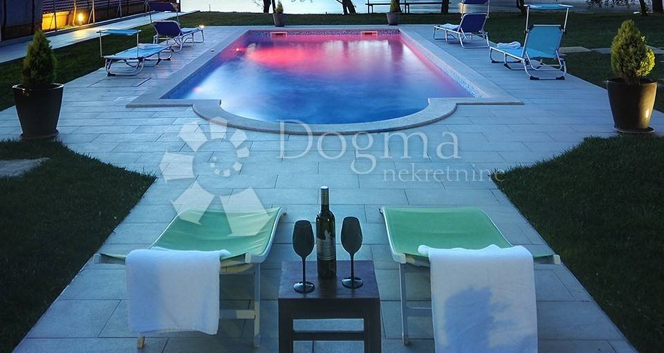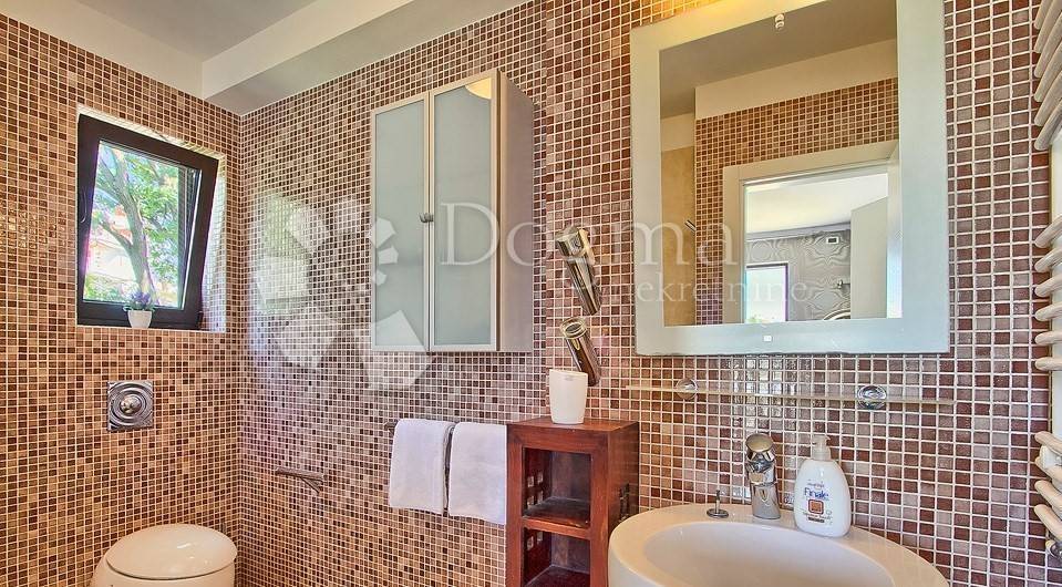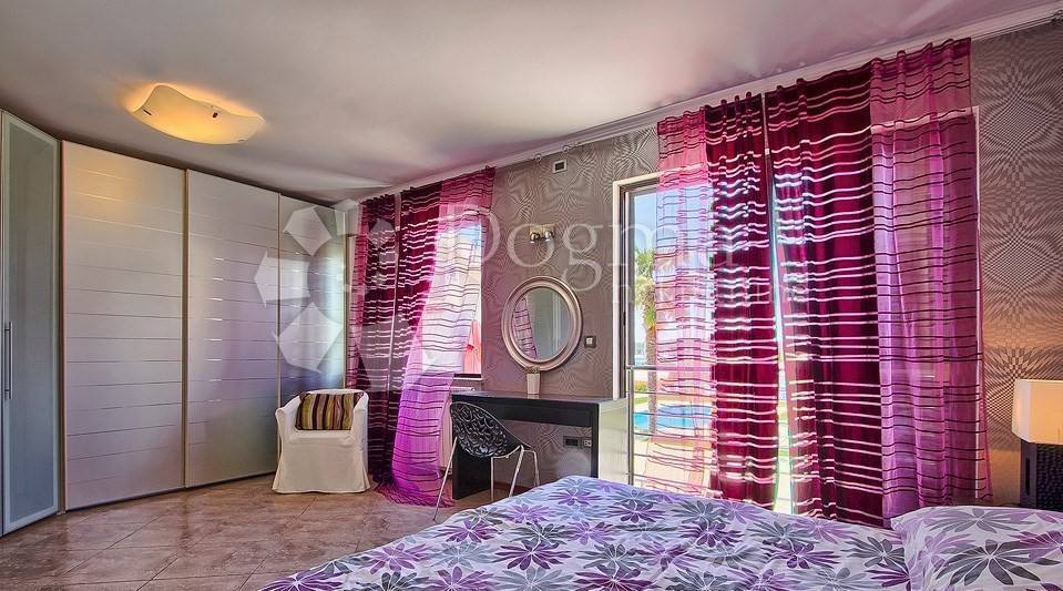 The villa consists of three bedrooms, three bathrooms, spacious living room, two kitchens, dining room and pantry. From the living room there is an exit to the terrace with a beautiful sea view. The central place in the beautifully landscaped and fenced garden is occupied by a swimming pool (40 m2) with sun deck and near the pool is a barbecue, outdoor bathroom and garden furniture. There is a possibility of expanding or increasing the area of this villa by building two more floors + attic and for which there is a permit. Parking for several vehicles is provided within the garden. The location of this villa is unique in the real estate market.