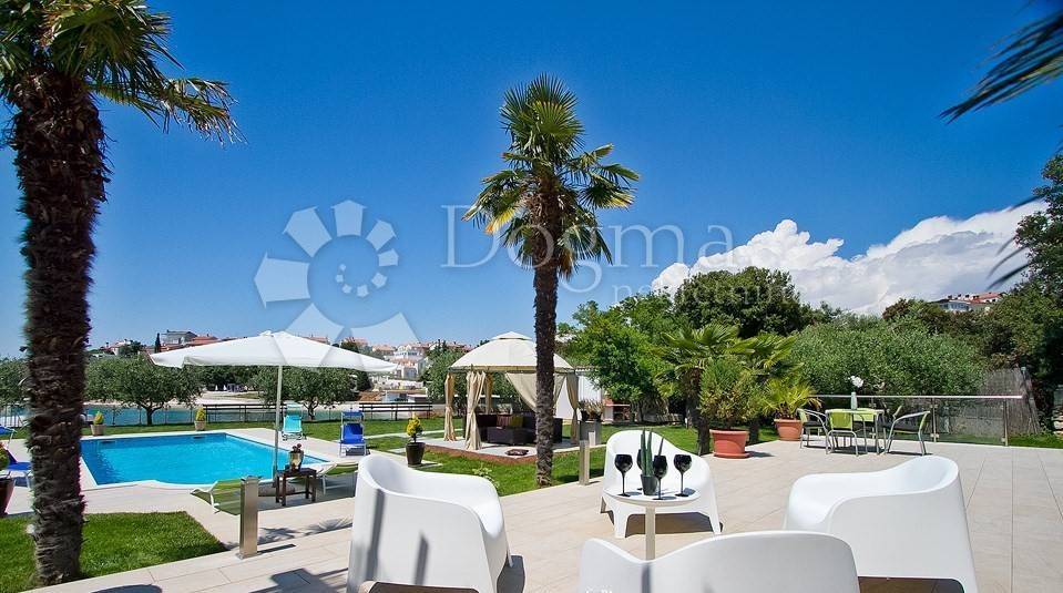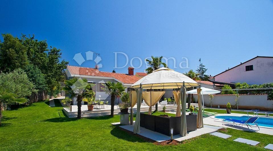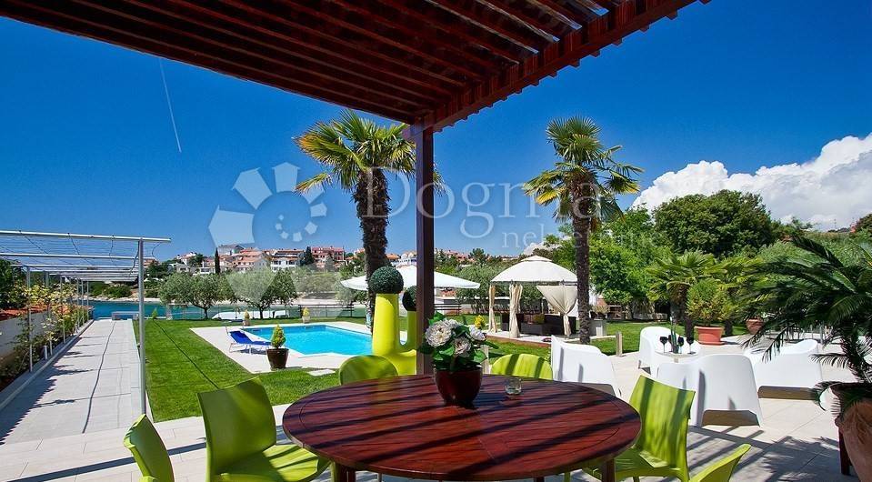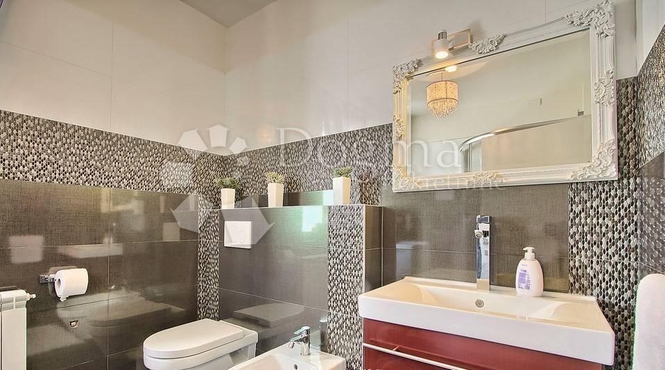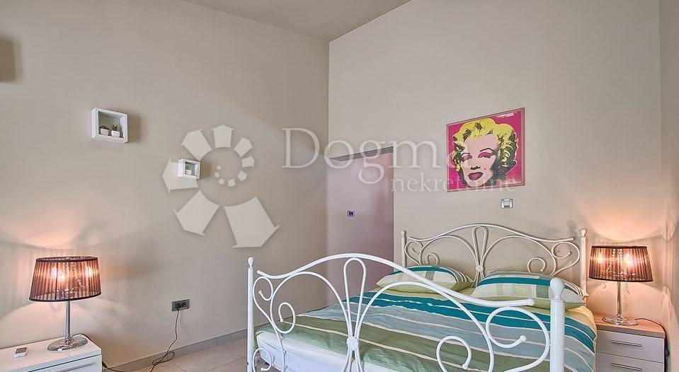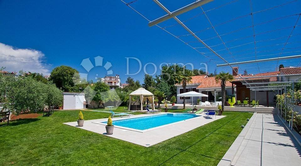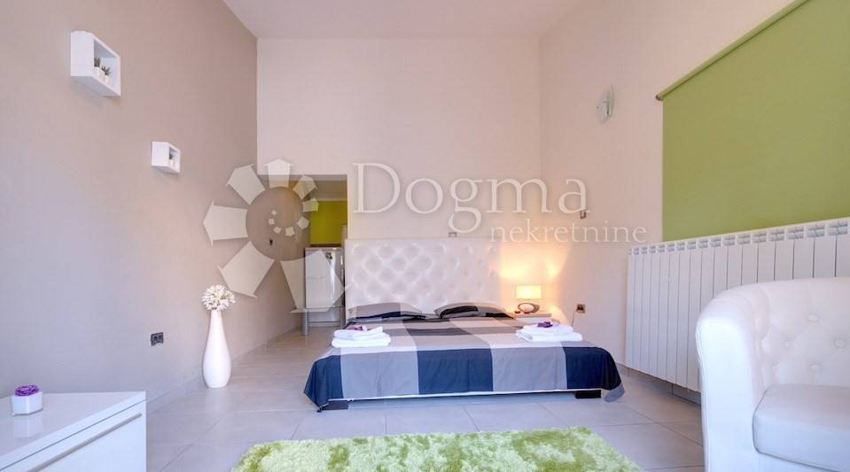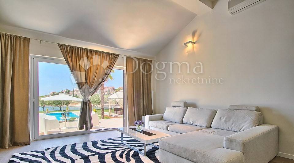 The villa consists of three bedrooms, three bathrooms, spacious living room, two kitchens, dining room and pantry. From the living room there is an exit to the terrace with a beautiful sea view. The central place in the beautifully landscaped and fenced garden is occupied by a swimming pool (40 m2) with sun deck and near the pool is a barbecue, outdoor bathroom and garden furniture. There is a possibility of expanding or increasing the area of this villa by building two more floors + attic and for which there is a permit. Parking for several vehicles is provided within the garden. The location of this villa is unique in the real estate market.