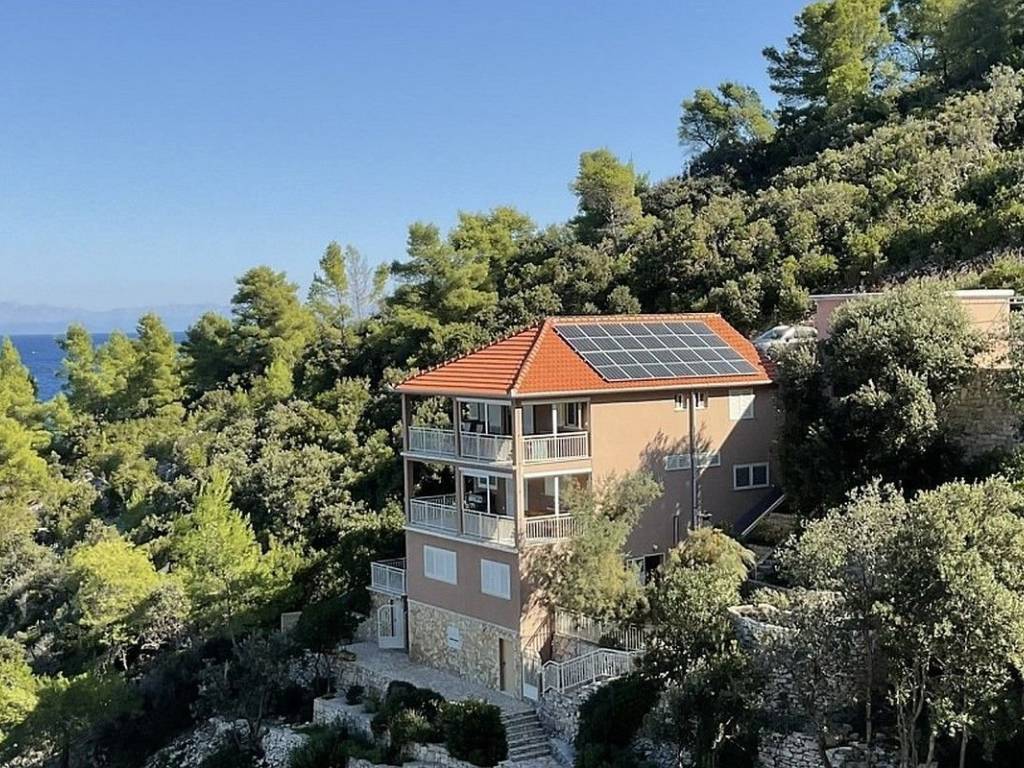 In a peaceful bay on the island of Korčula, a beautiful seafront house is for sale, located directly by the sea. The bay is home to only two houses, ensuring complete privacy and a unique sense of tranquility that is rarely found today. Construction was completed in 2017, and the last renovation was carried out in 2022, when the owner additionally upgraded and modernized the property.   The house consists of three separate residential units, a three-bedroom, a two-bedroom, and a one-bedroom apartment, each with its own entrance and terrace, providing comfortable living for a larg-er family or excellent potential for tourist rentals. The interior has been carefully designed, featuring modern bathrooms with walk-in showers, and two 100-liter water heaters providing ample hot water. The roof is thermally insulated with 20 cm of insulation, further enhancing the home’s energy efficiency. The attic offers additional storage space, while the ground floor includes a laundry room and auxiliary facilities.   A 6 kW solar power system ensures energy independence for most of the year, and water filters are installed in one apartment.   The landscaped garden has an automatic irrigation system, and in front of the house there is a garage with electric roll-up doors and additional covered parking for up to six cars. The entire property is under video surveillance. The outdoor area features a barbecue, outdoor showers, and a seaside dining table perfect for gatherings and dinners while enjoying the sea view.   The sea is just a few steps away, with access via stairs leading to the beach or directly from the waterfront. In front of the house, there is a small private pier suitable for mooring a boat, as well as a stone sunbathing platform. The terraces can be enclosed with panels to provide shade and protection from the wind. There is also the possibility of building a swimming pool, which would further complete the sense of Mediterranean luxury.   The house is currently used for tourist rental and achieves excellent results, yet its prime seafront location, with no road or promenade in front, also provides a perfect setting for private enjoyment. The combination of peace, sea, and nature, along with modern amenities and the warmth of home, makes this property truly unique on the market.