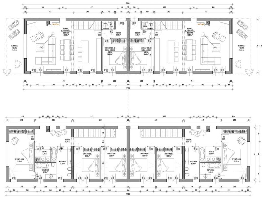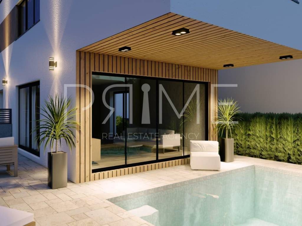 Građevinsko zemljište površine508 m²s izdanom i u cijelosti plaćenom građevinskom dozvolom zadvojnu modernu vilu s bazenom. Dozvola obuhvaća izgradnjudvije kuće (dvojnog objekta),od kojih svaka imaneto površinu 171,15m²te vlastitibazen površine 24 m². Projekt predviđa suvremeno arhitektonsko rješenje s naglaskom na funkcionalnost, estetiku i privatnost. Svaka vila sastoji se od: kuhinje, blagovaonice, dnevnog boravka,četiri spavaće sobe,WC-a,dvije kupaonicetevešeraja.Prostori su pažljivo raspoređeni kako bi pružili maksimalnu udobnost i komfor. Također postoji mogućnostizmjene projekta,poput izgradnje samostojeće kuće ili stambene zgrade, a u tom slučaju se budućem vlasnikuuračunavaju već plaćeni komunalni doprinosi. Zemljište se nalazi nanajatraktivnijem dijelu otoka Vira – Prezidi, poznatom po miru, zelenilu i visokokvalitetnom okruženju. Udaljenost do mora i prekrasne pješčano-šljunčane plaže iznosi svega250 metara, što ovu lokaciju čini idealnom za luksuzno stanovanje, turistički najam ili investiciju. Za dodatne informacije ili dogovor oko razgledavanja –kontaktirajte nas!