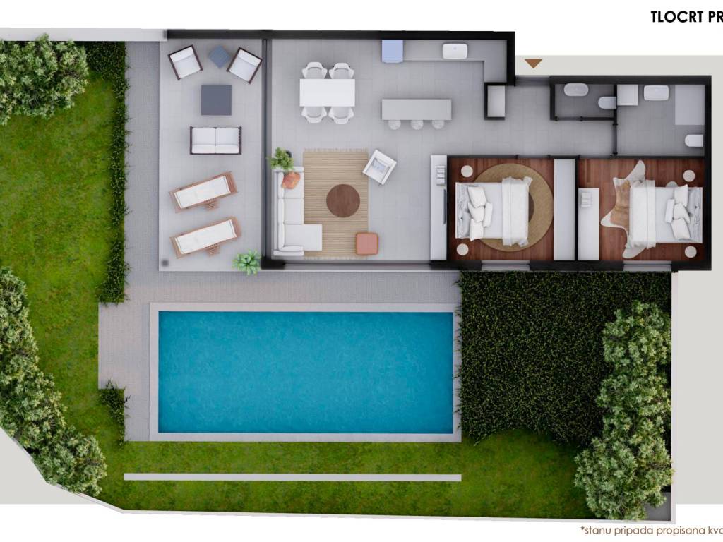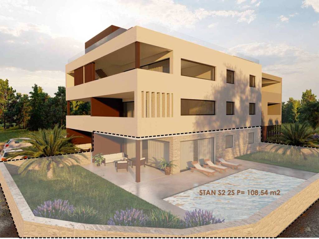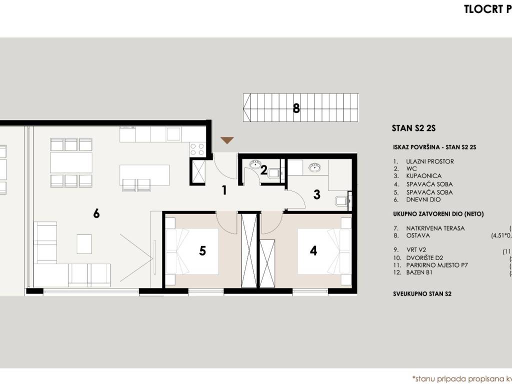 S2 - prizemlje, dvosoban stan sa vrtom i bazenom 108,55 m² - 530.000,00 €