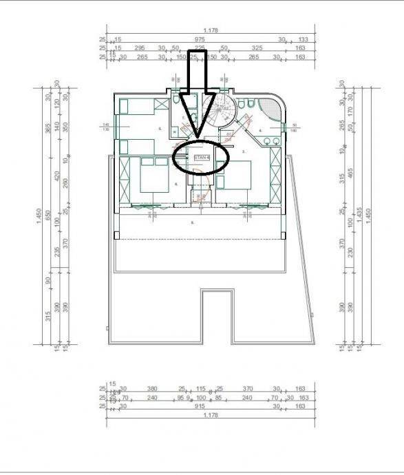 Na drugoj etaži stana nalazi se predsoblje površine 5,04 m2 , 3 spavaće sobe ( 13,72 m2 / 9,98 m2 / 9,88 m2 ) , 2 kupaonice ( 5,47 m2 / 3,58 m2 ) , stepenice koje zauzimaju površinu od 2,84 m2 te prostrana terasa površine 34,79 m2 na kojoj je pripremljena mogućnost postavljanja jacuzzija .