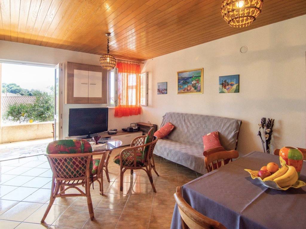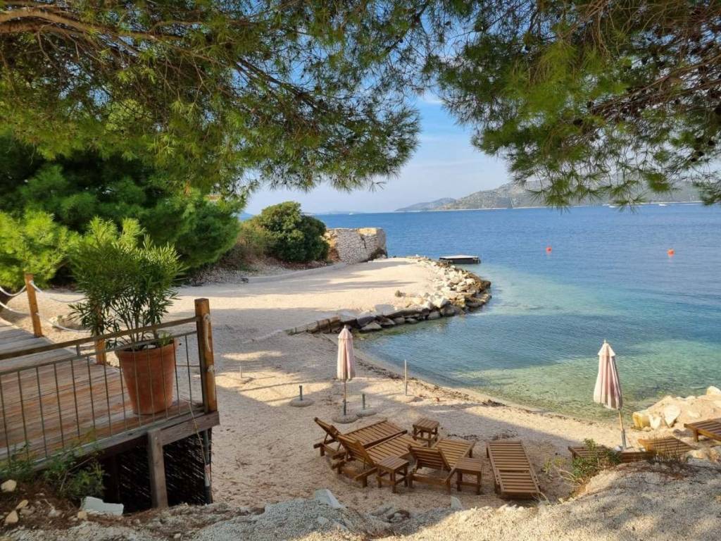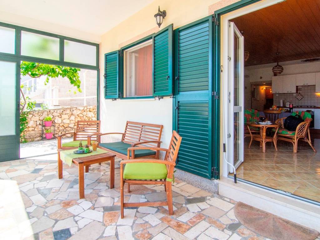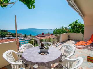 A charming house in an excellent location, close to the sea and the beach and with a beautiful view is for sale. The house of approximately 100 m2 of internal space is located on a plot of 449 m2.It has two floors: ground floor and first floor. On the ground floor there is an apartment with two bedrooms, a bathroom, a living room, a kitchen and a dining room. From the living room there is an exit to a covered terrace ideal for socializing and dining outdoors. An external staircase leads to the first floor where there is a spacious terrace with a beautiful sea view. From the terrace there is access to the apartment which also contains two bedrooms, a bathroom, a living room, a kitchen and a dining room. The house is sold furnished and equipped. It is maintained and ready to move in, but requires refreshing the space.Next to the house, in a small stone outbuilding there is a furnished studio apartment of 16 m2. There are also two more additional buildings on the land, a 9 m2 house that serves as a fireplace and a 22 m2 building that currently serves as a storage room, but leaves space for future buyers to decorate it according to their own wishes. The plot also includes parking for two cars and a garden planted with Mediterranean plants.The orientation of the house to the south provides it with plenty of light and airiness during the day. The quiet location and proximity to the sea make this property ideal for those looking for a holiday home or those with the ambition of renting it out for tourist purposes.The distance from the sea and the nearest beach is only 100 m, from the town of Trogir 10 km, and from Split airport 14 km.