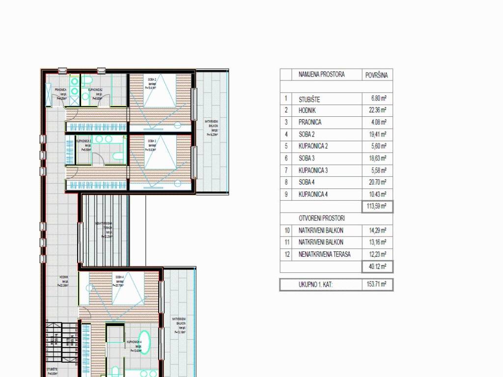 Unutarnjim stubištem dolazi se na kat, gdje se nalaze tri komforne spavaće sobe, svaka s vlastitom kupaonicom, praonica rublja te dva natkrivena balkona.