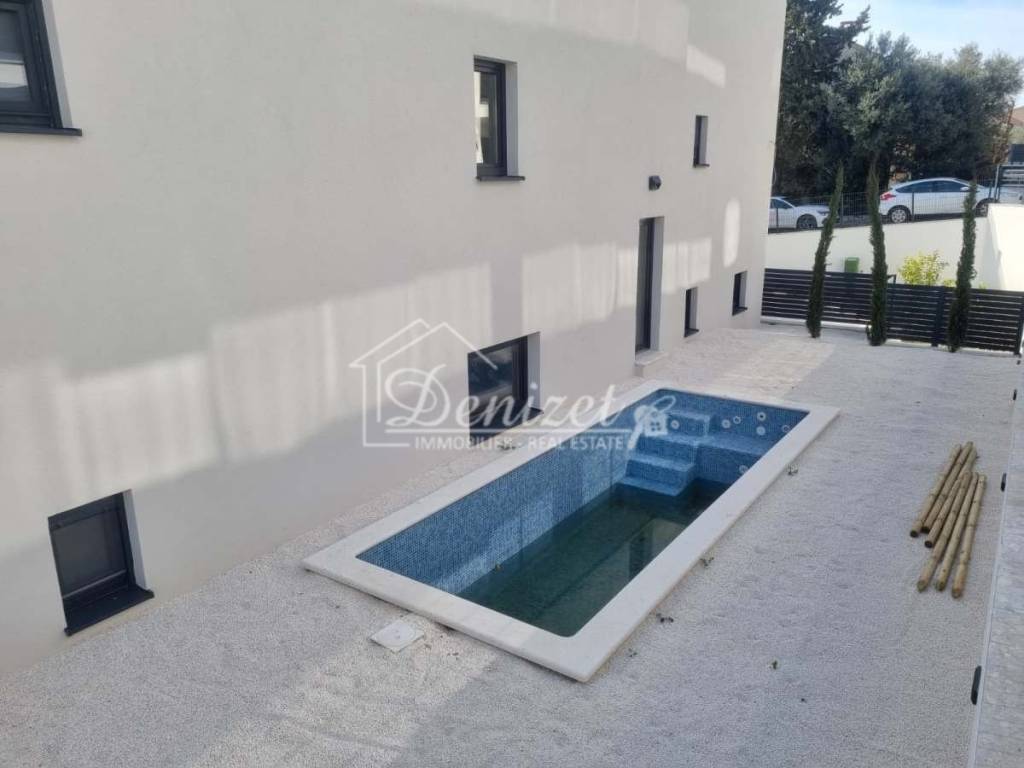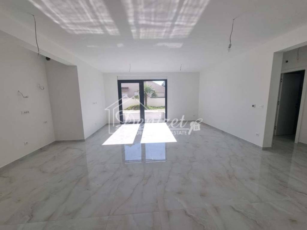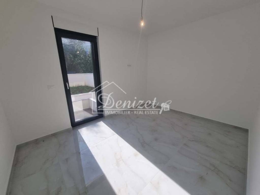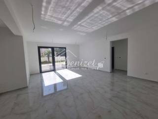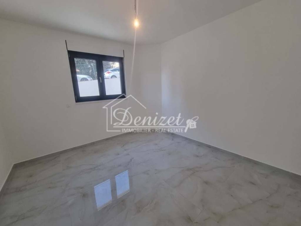 For sale is a three-bedroom apartment in a new residential building in Okrug Gornji, on the southern side of the island of Čiovo. The building has four floors (basement, semi-basement, ground floor, and first floor) and contains six residential units. The apartment for sale is in the semi-basement, which has the feel of a ground-floor unit.