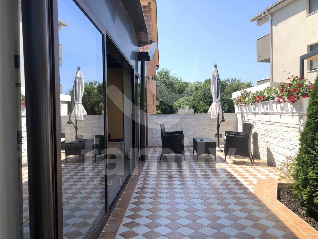 The first floor of the property consists of a covered dining area, the floors and sidewalks as well as the stairs are covered with stone. The central part of the house of 100 m2 is equipped with a large seating area, a TV and a billiard table. On the left and right sides from the central part there is an entrance to the apartments on the first floor. Two of the four apartments have been renovated and modernly equipped with new kitchen appliances with an induction hob and consist of a living room, bedrooms and a new bathroom. The entire building is equipped with air conditioning units in all rooms. Each apartment has high-quality laminate floors in the living and sleeping areas, the bathrooms are equipped with tiles and access to the stone-clad terraces that belong to the apartment. The villa is located on a very pleasant and well-lit plot, which means that its rooms are also sufficiently illuminated. It is rich in content and completely high-quality design. In front of the property there are three covered parking spaces, and at the back there are two parking spaces in the yard itself. The property is equipped with furniture, video surveillance, Wifi devices and a sewage connection.