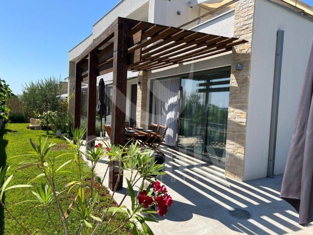 This semi-detached luxury villa with a total area of 150 m2 is located in Peroj. It is spread over two floors, ground floor and first floor. On the ground floor there is a toilet, a bathroom, two bedrooms and each has access to a shared terrace of 100 m2 with a phenomenal open view of the sea and the Brijuni Islands, a spacious bright living room, kitchen and dining room. On the first floor of the villa there is a spacious bedroom with wardrobe and bathroom and a terrace. The garden has a swimming pool with a view of the sea, a sunbathing area and a barbecue area, which completes the overall atmosphere. The villa is sold well-furnished with all kitchen appliances and elements, equipped with ALU carpentry with double-glazed windows and separate electricity meters and with a common water meter, the heating and cooling system is regulated with 4 air conditioning units each. It is successfully rented during the tourist season. The property is located in an oasis of peace, surrounded by nature, and the distance to the first organized beaches is only five minutes on foot.