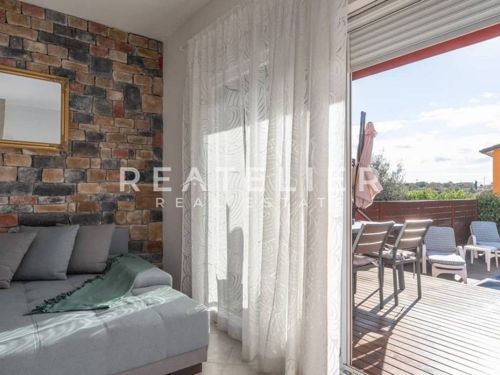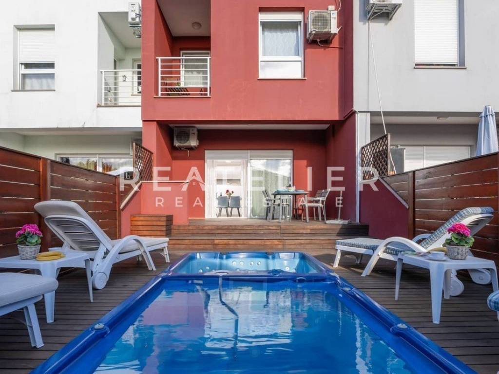 The courtyard of the house is oriented to the south and consists of a terrace with a pool and a jacuzzi.