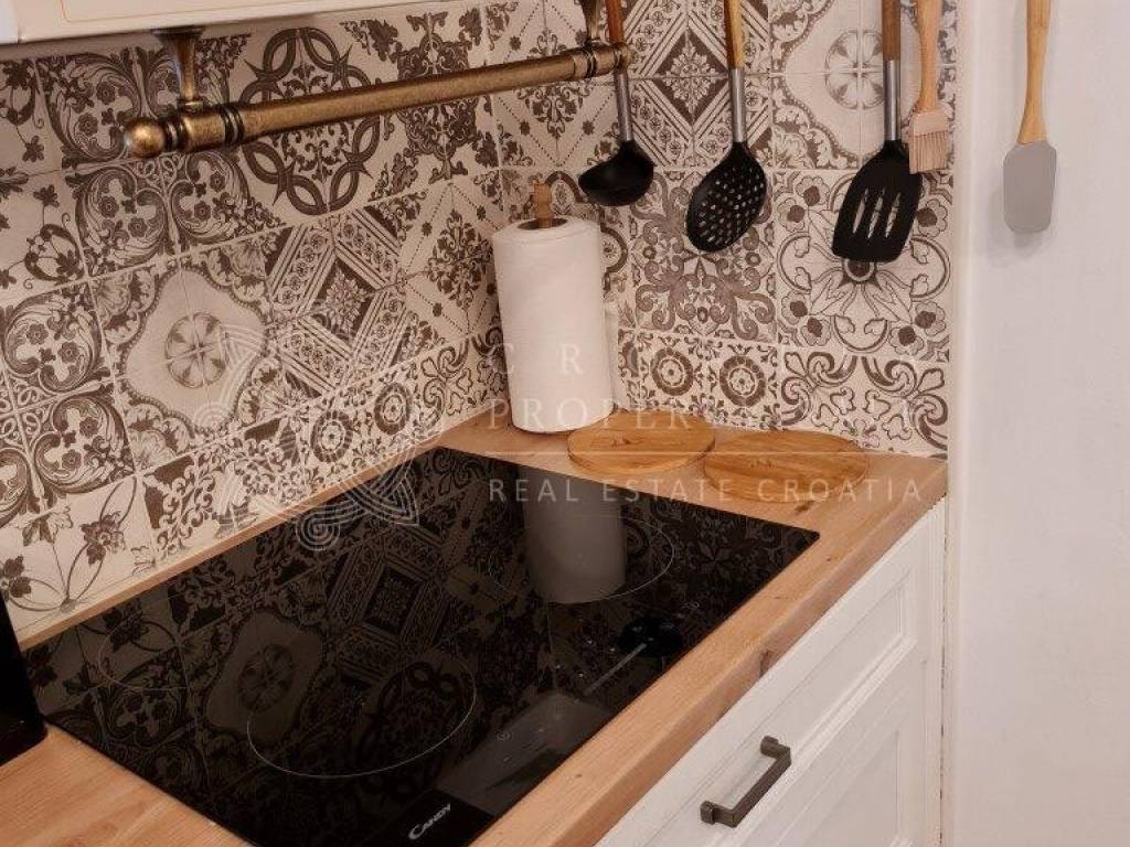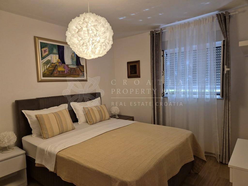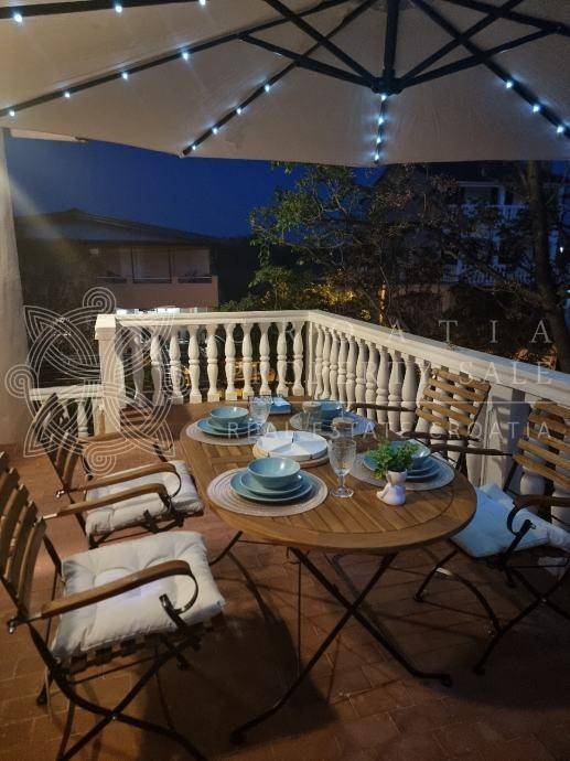 House has 2 floors. Ground floor apartment features 2 bedrooms, bathroom and open plan kitchen with dining and living room. Outside cozy terrace in shade is protected from wind, and opens to the large green garden with Mediterranean plants such is fig tree, lemons and tangerines, pomegrantes and flowers. There is additional small cottage in the garden, suitable for storage. On the other side is garage, and parking for 2-3 more cars.
