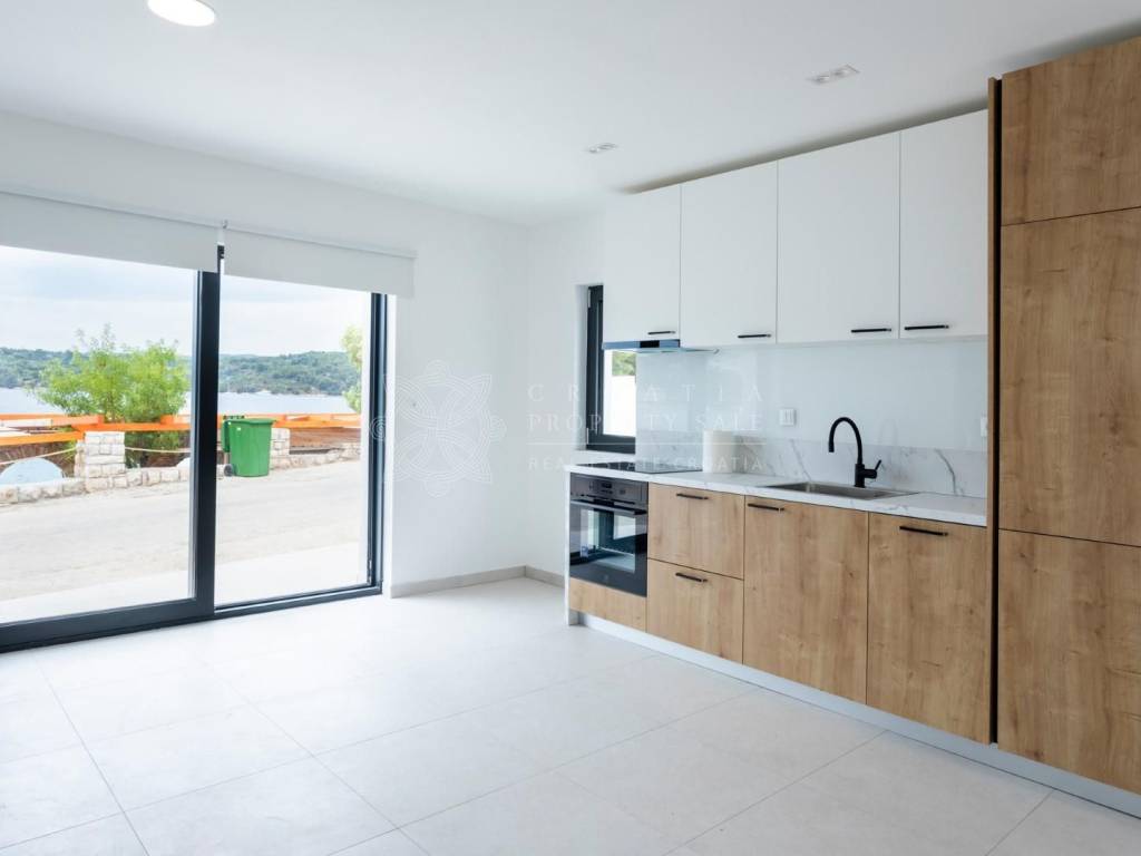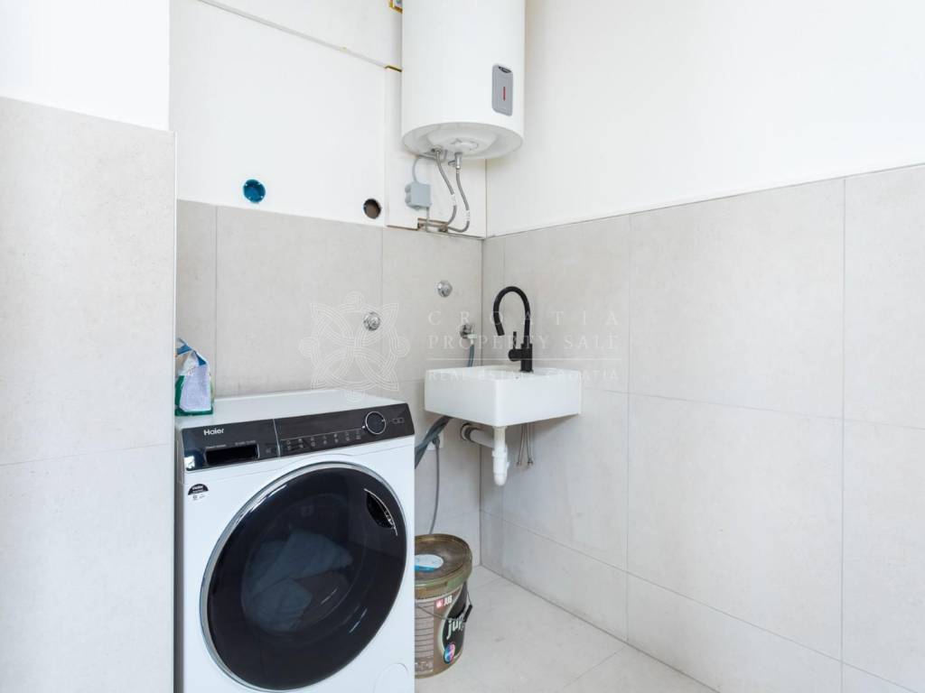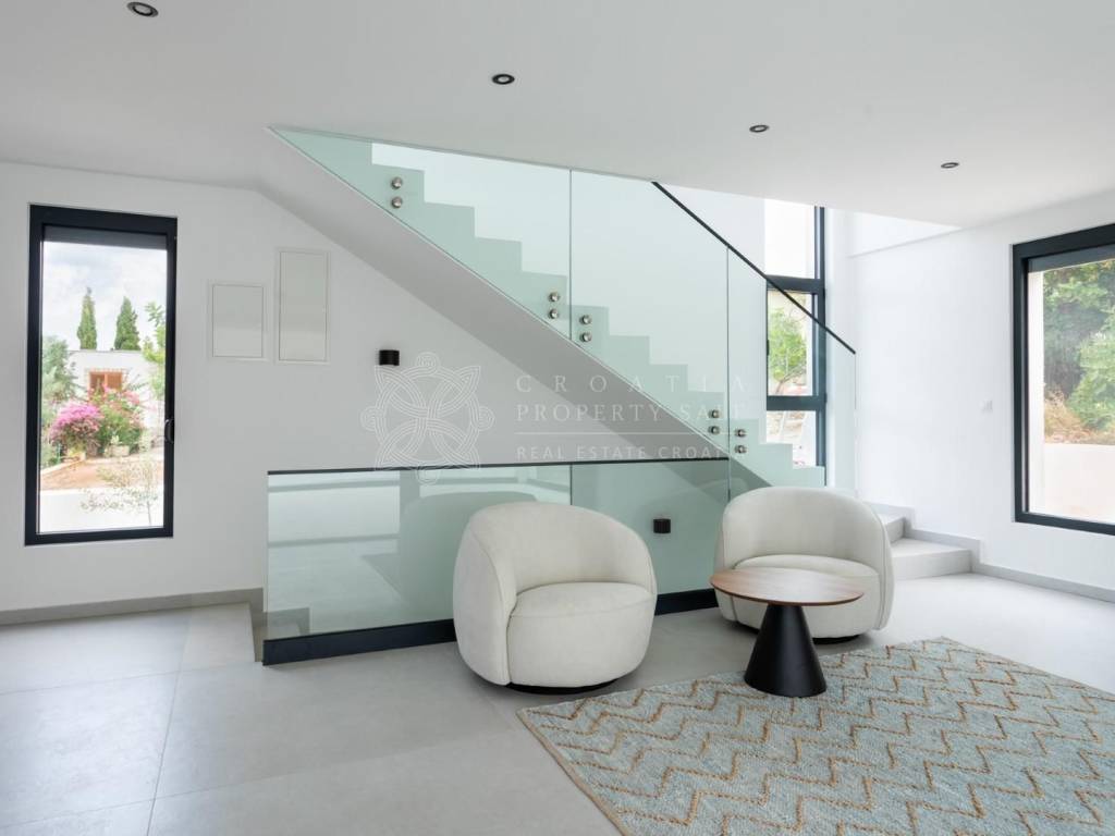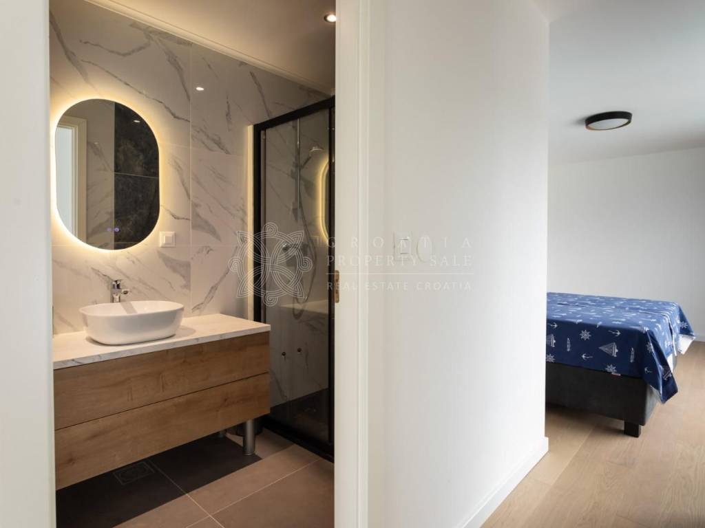 The villa has just been built, a few more details need to be completed. The villa is located on a plot of 690 m2 and has 260 m2 of living space.It is fully furnished and the furniture is included in the price. The villa has parking for 3 vehicles, and there is more parking in the public area next to the street. At the street level there is a small spacious apartment, equipped with a new kitchen and a modern bathroom, a bed and soon other furniture. On the central spacious terrace there is a swimming pool, and a spacious outdoor area for daily socializing, dining and sunbathing. An additional area for sunbathing, surrounded by a glass fence so that you can enjoy the beautiful view of the sea undisturbed, is located on the roof of the apartment.