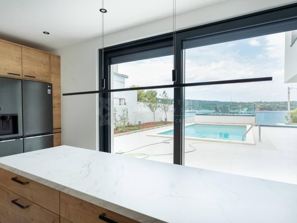 From the spacious terrace you enter the spacious dining room and kitchen, which also have a wonderful view of the sea and the pool. The modern large kitchen is equipped with all the necessary appliances of the highest quality, a refrigerator with an ice maker, a modern cooker with a hood inside the cooker, a dishwasher and enough space to store all the kitchen equipment and dishes.
