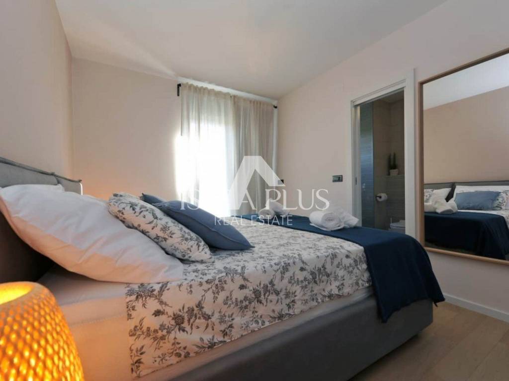 Open living room, fully equipped kitchen and dining room with access to terraces and landscaped courtyard in Mediterranean style with pool and summer kitchen, and playground for children.