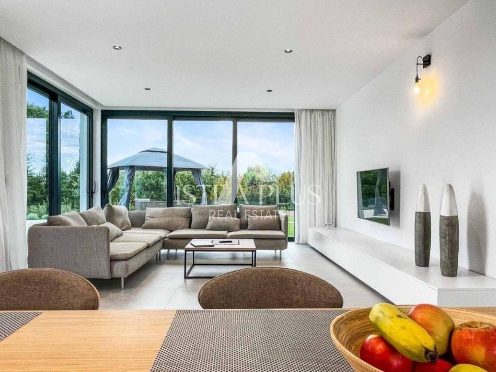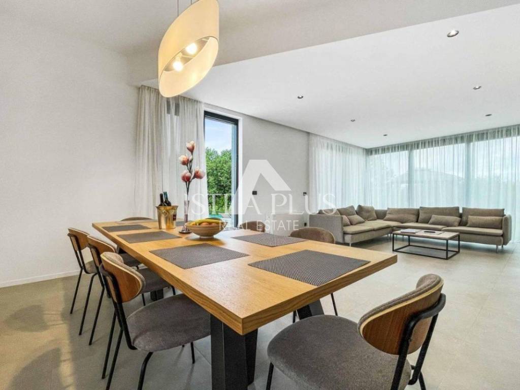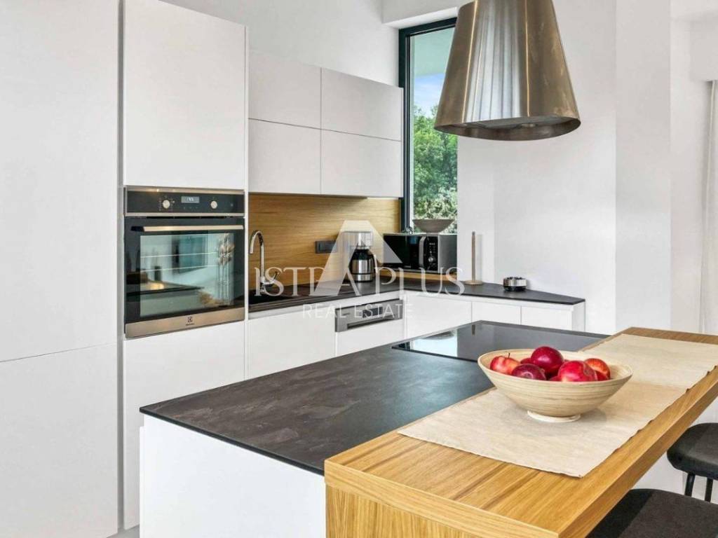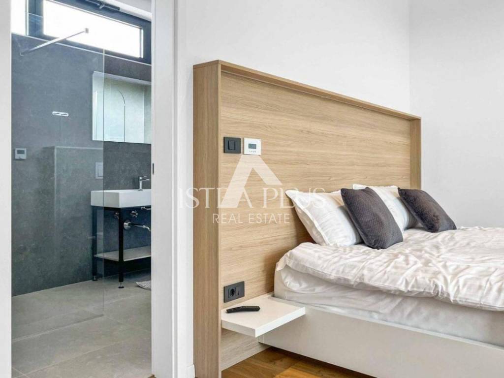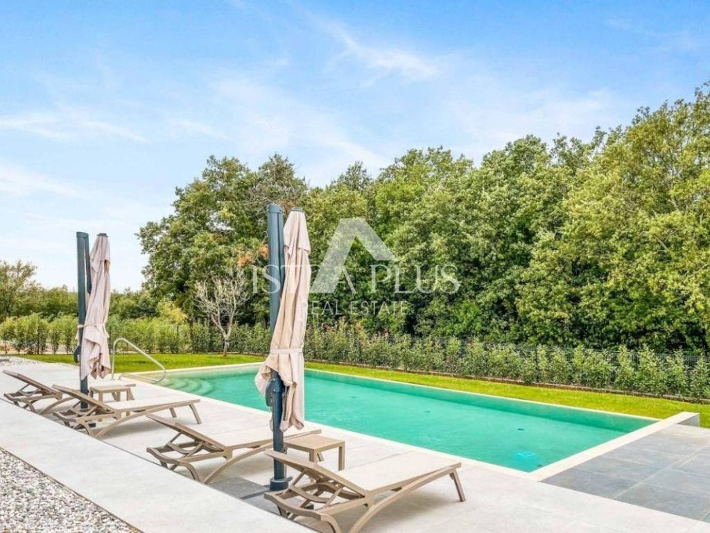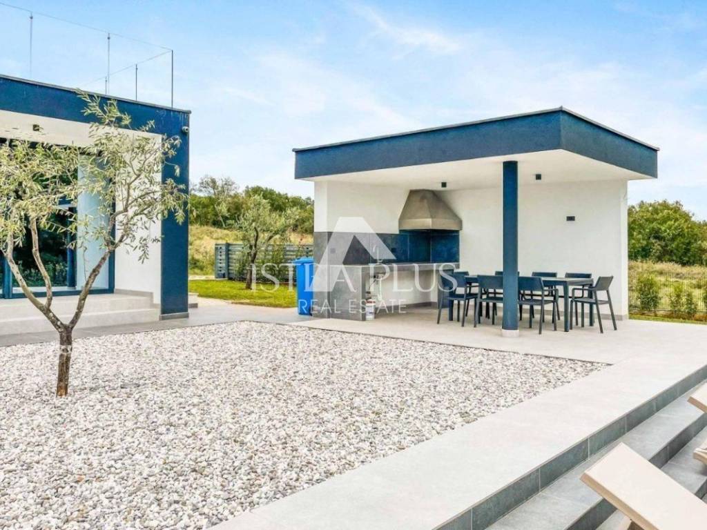 A modern luxury villa with a beautiful design in a quiet environment, 10 km from Poreč. The villa extends over three floors with a total area of 403 m2 of living space and is located on a plot of 1450 m2. On the ground floor there is one bedroom with a bathroom, a guest toilet, a storage room, a kitchen and a dining room with a living room from which there is a terrace and a yard where there is a sunbathing area and a 50m2 swimming pool. There is also a summer kitchen with a fireplace and outdoor dining area. On the 1st floor, there are three spacious bedrooms, each with its own bathroom and access to the terrace with a view of the sea and the countryside. In the basement there is a wellness area with sauna, jacuzzi, relaxation zone and shower. Cooling / heating in the villa is solved by a heat pump, the entire villa has underfloor heating. The villa has 3 parking spaces.
