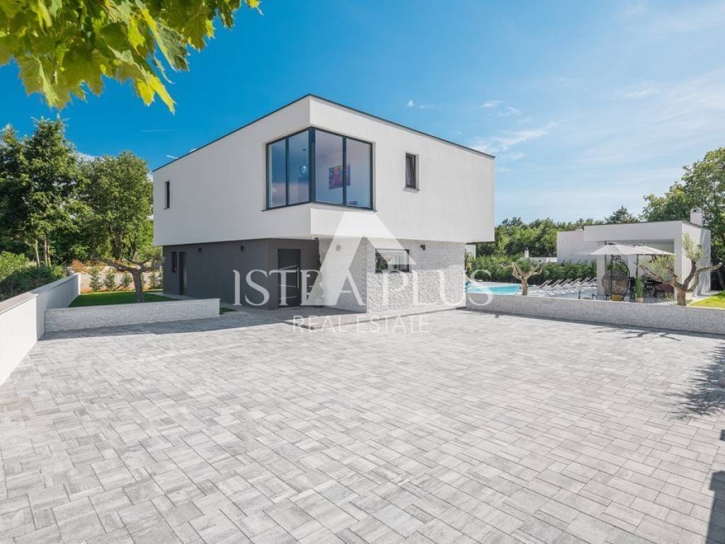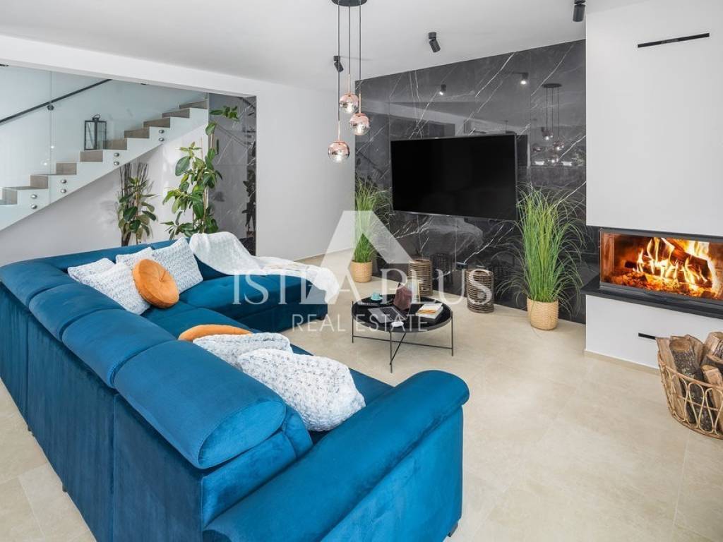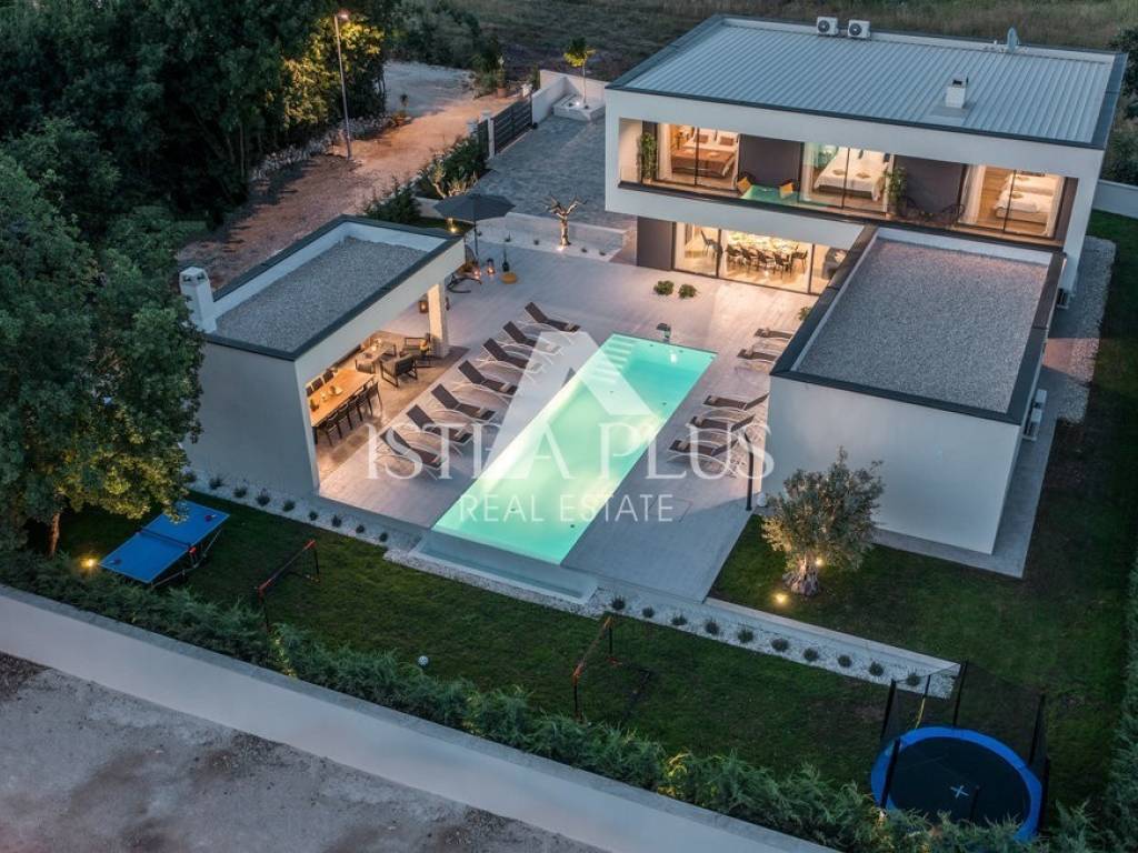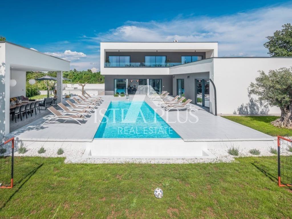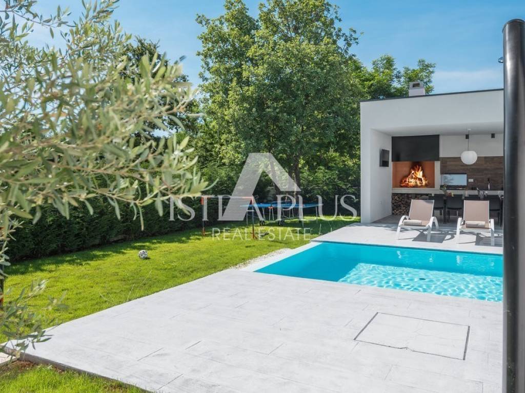 An impressive villa of modern architecture and design. This beautiful villa is not only visually appealing, but also impresses with its quality and functionality. It is located in the interior of Istria, surrounded by greenery, on an approximately 1000 m large and fenced plot that offers a lot of peace and privacy. The interior extends over the ground floor and first floor. The open spaces consist of a large living room with a fireplace, kitchen and dining room, while each bedroom has its own bathroom with air conditioning and television. Huge glass surfaces flood the rooms with light and provide direct access to the terraces overlooking the garden and pool. In the garden you will find a refreshing pool with a sunbathing area and an outdoor kitchen, next to which is a comfortable lounge. There are many playgrounds for fun and games.