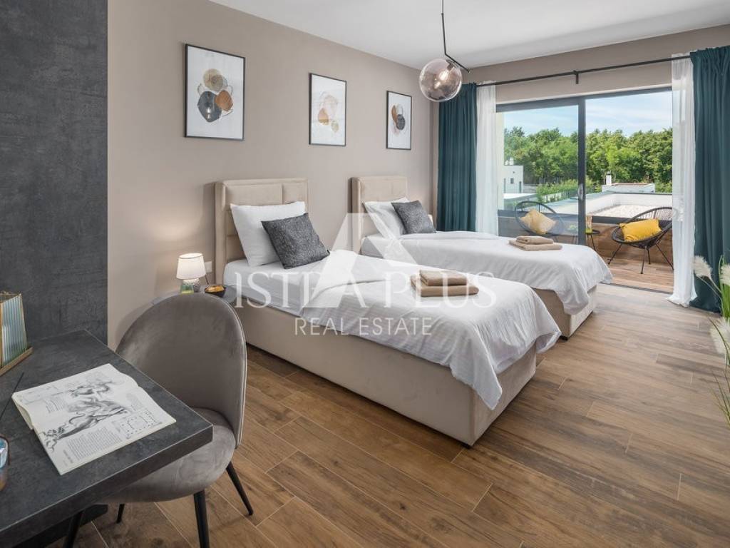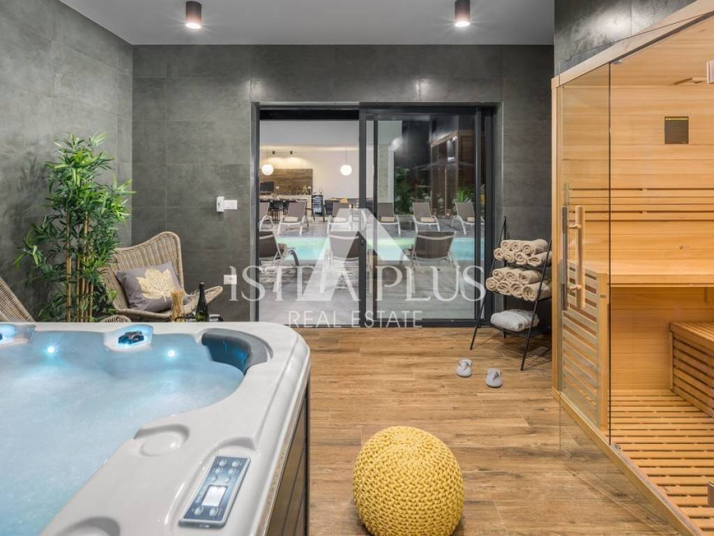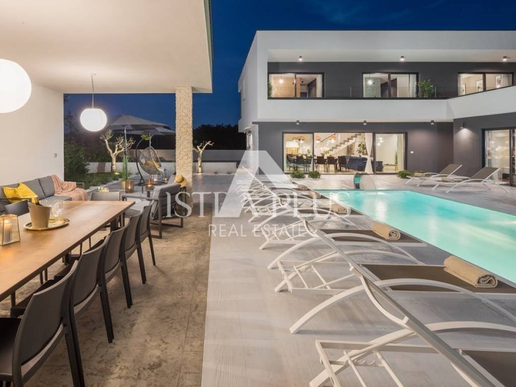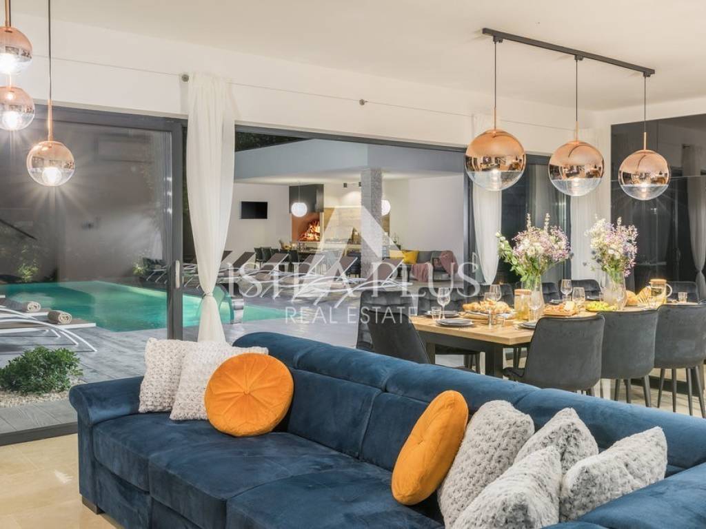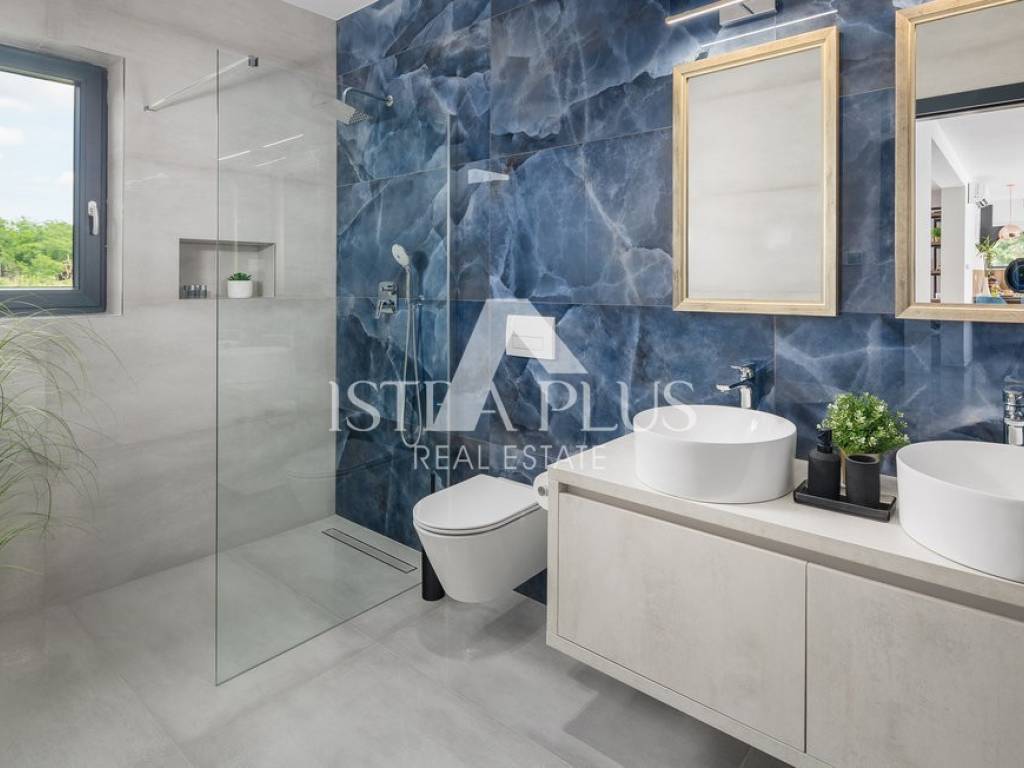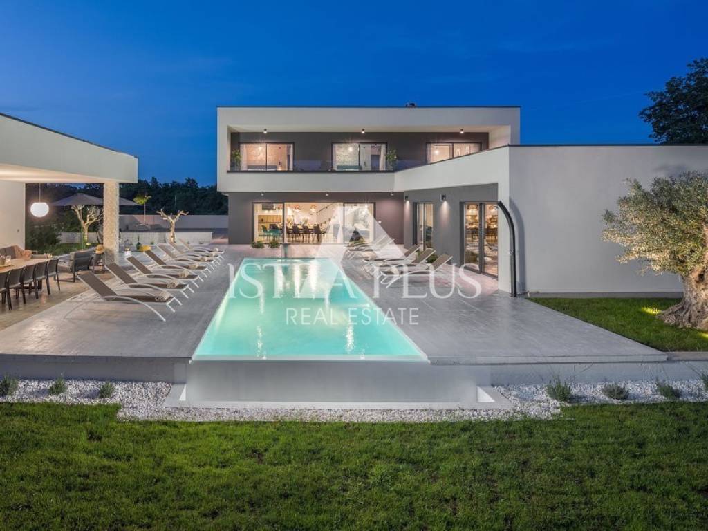 An impressive villa of modern architecture and design. This beautiful villa is not only visually appealing, but also impresses with its quality and functionality. It is located in the interior of Istria, surrounded by greenery, on an approximately 1000 m large and fenced plot that offers a lot of peace and privacy. The interior extends over the ground floor and first floor. The open spaces consist of a large living room with a fireplace, kitchen and dining room, while each bedroom has its own bathroom with air conditioning and television. Huge glass surfaces flood the rooms with light and provide direct access to the terraces overlooking the garden and pool. In the garden you will find a refreshing pool with a sunbathing area and an outdoor kitchen, next to which is a comfortable lounge. There are many playgrounds for fun and games.