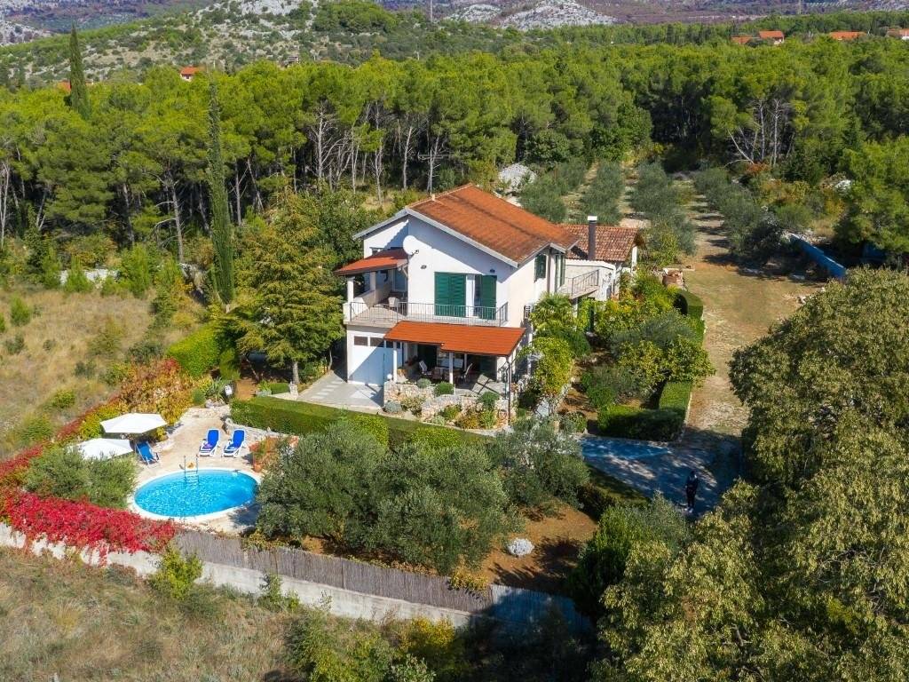 Layout: Ground Floor: Entrance hallway Storage room Open-plan kitchen, dining, and spacious living area with access to the terrace and pool Garage (16.91 m) Basement (14.81 m) First Floor: Hallway leading to a large terrace Three bedrooms (two with balconies) Bathroom Additional Features: Traditional Dalmatian tavern (konoba) with WC and covered terrace perfect for gatherings (77 m) Summer kitchen and boiler room Beautiful Mediterranean garden with olive trees Paved sun deck with outdoor shower Partially fenced yard for privacy Location Highlights: Only 4 km from Šibenik city center 6 km from the nearest beach This property is a true retreat combining peace and privacy with close proximity to the sea, beaches, and vibrant city life.