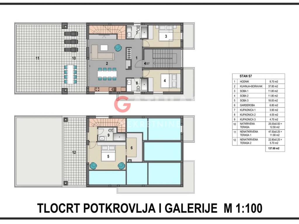 The apartment spans two floors and offers a layout that combines functionality and comfort: hallway, kitchen connected to the living room, three bedrooms, a walk-in closet, three bathrooms, and one covered and two uncovered terraces. The terraces provide a stunning view of the sea and the nearby islands of Škrda and Maun – an ideal place to enjoy morning coffee or unforgettable sunsets.