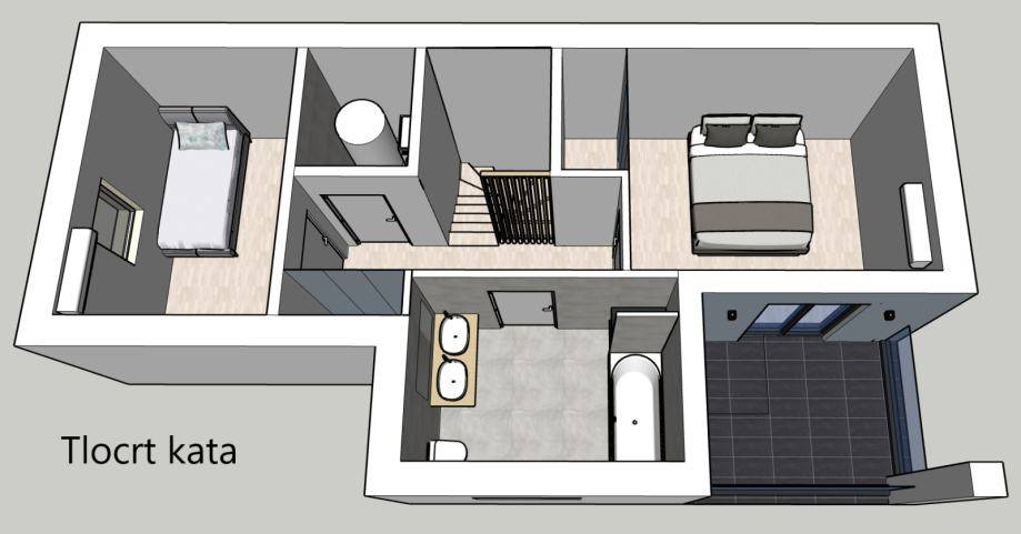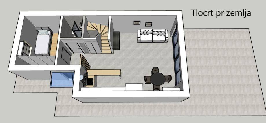 Prizemlje: Open space -prostrani dnevni boravak i moderna kuhinja s blagovaonom, spavaća soba, kupaonica s tušem