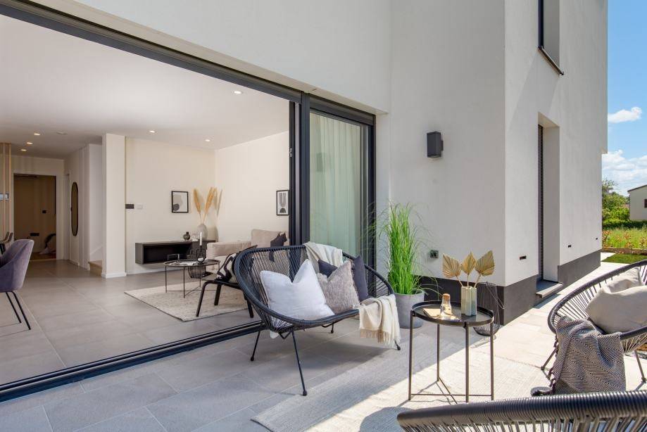 Velike staklene stijene povezuju dnevni prostor s terasom od 32m2 i dvorištem, dajući osjećaj otvorenosti i luksuza