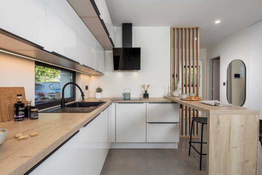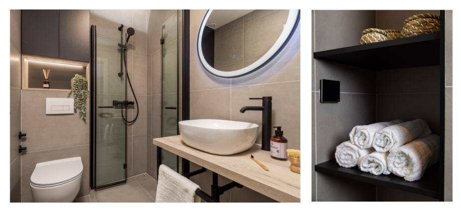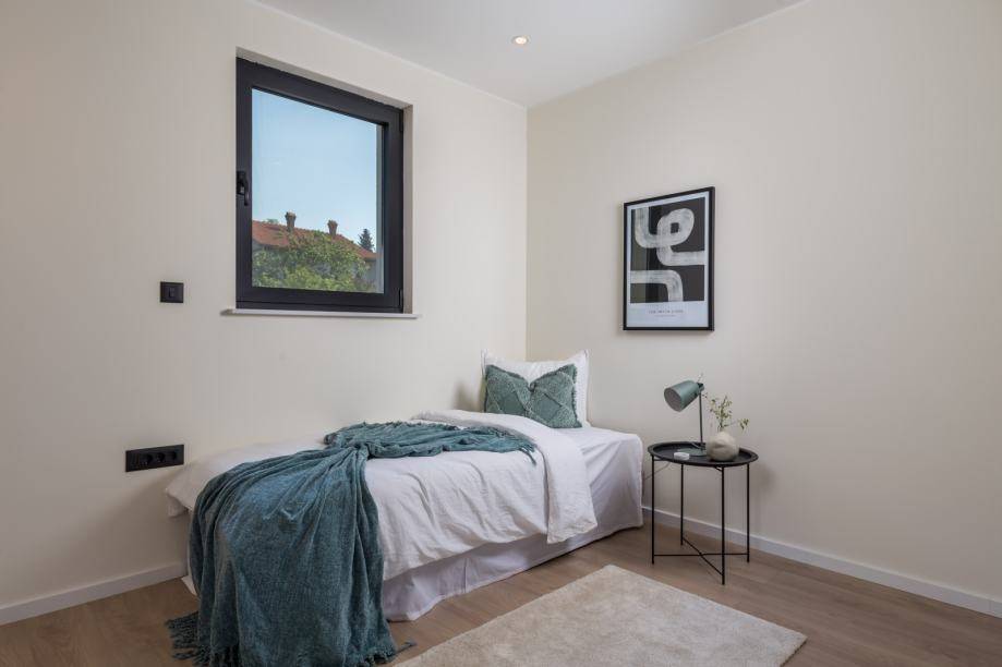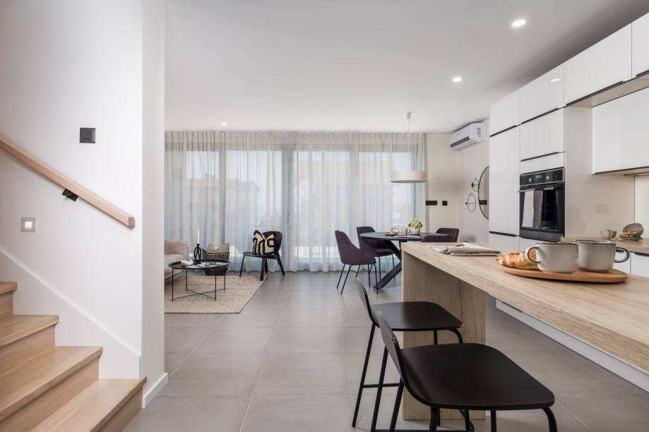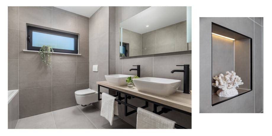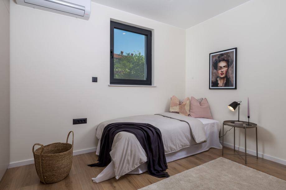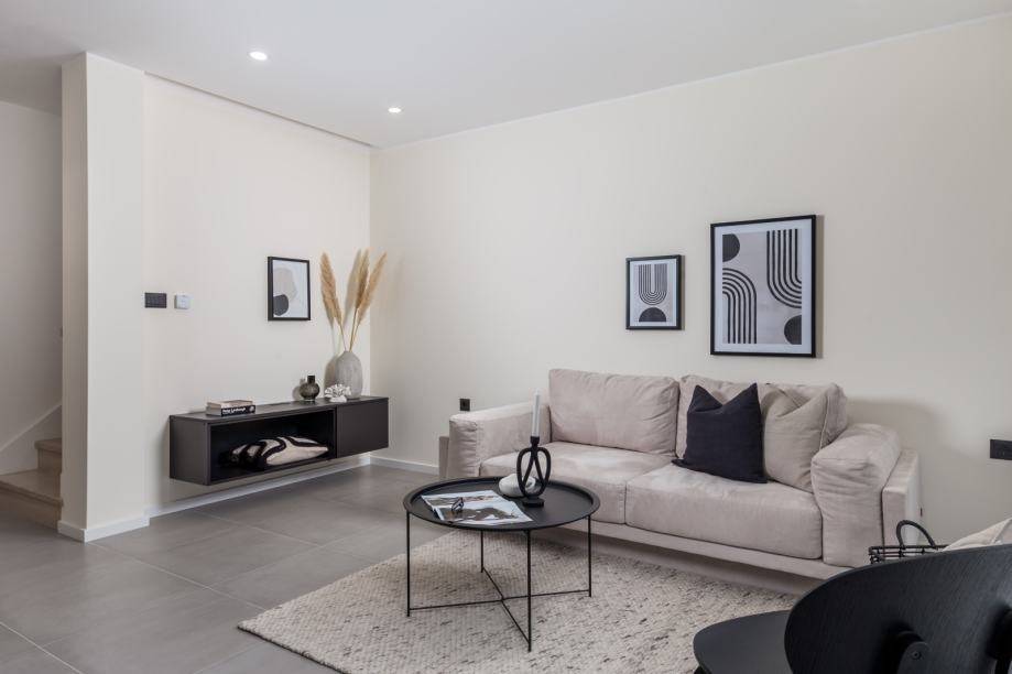 Kuća je potpuno namještena, uređena u skandinavskom stilu, s kvalitetnim namještajem po mjeri i neutralnim tonovima koji stvaraju elegantan i prozračan ambijent
