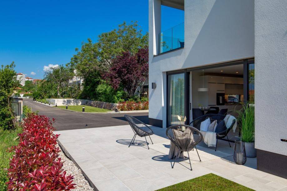 Posredujemo u najmu luksuzne moderno uređene dvoetažne kuće u mirnom riječkom naselju Hosti — idealna za obitelj ili one koji žele vrhunski standard, privatnost i komfor u arhitektonski suvremenom prostoru s puno prirodnog svjetla i velikom terasom.