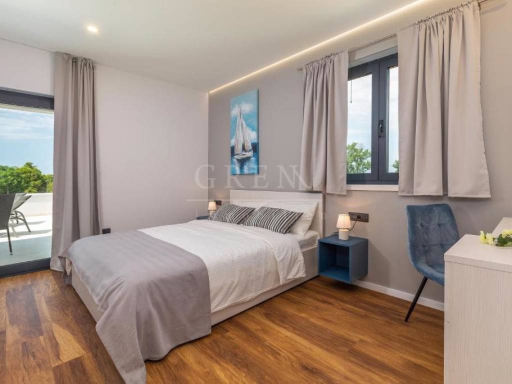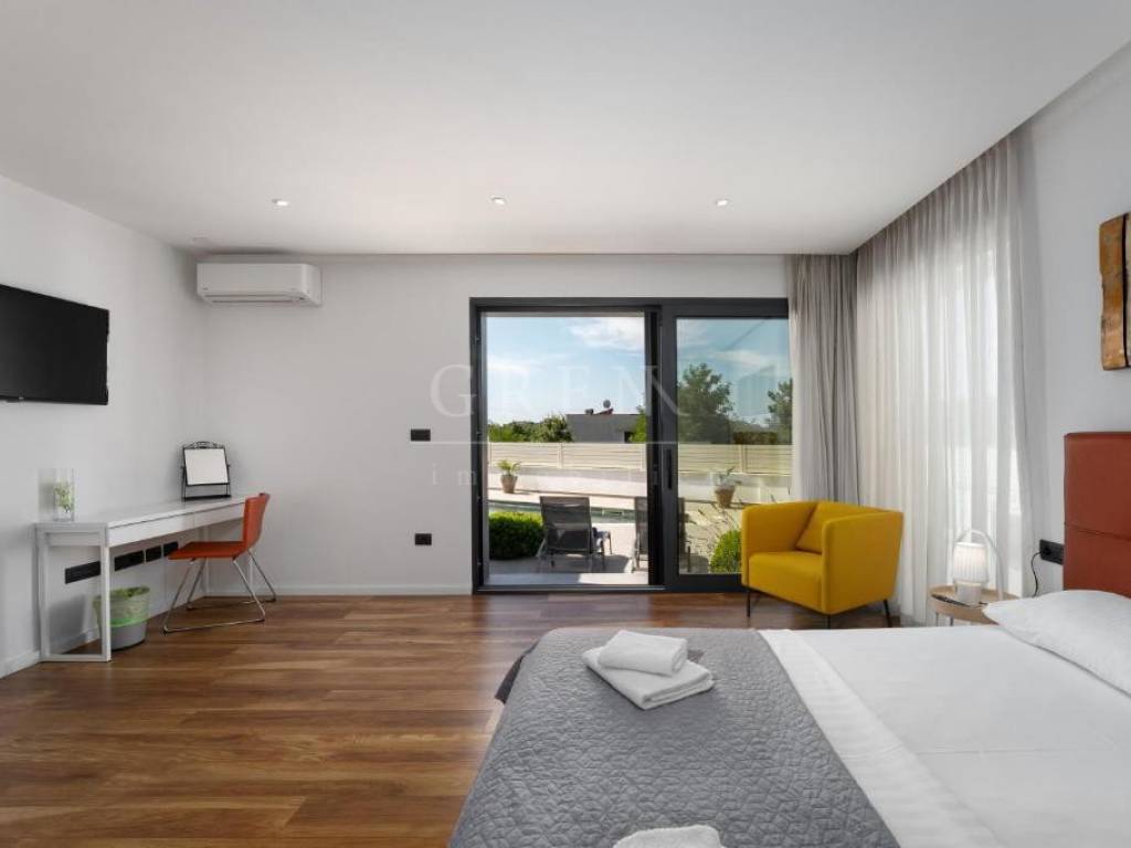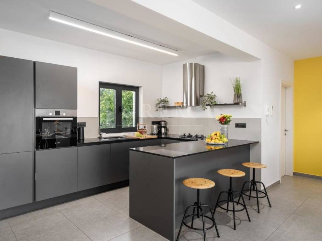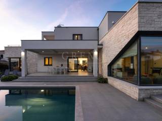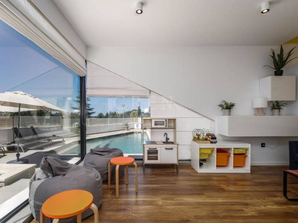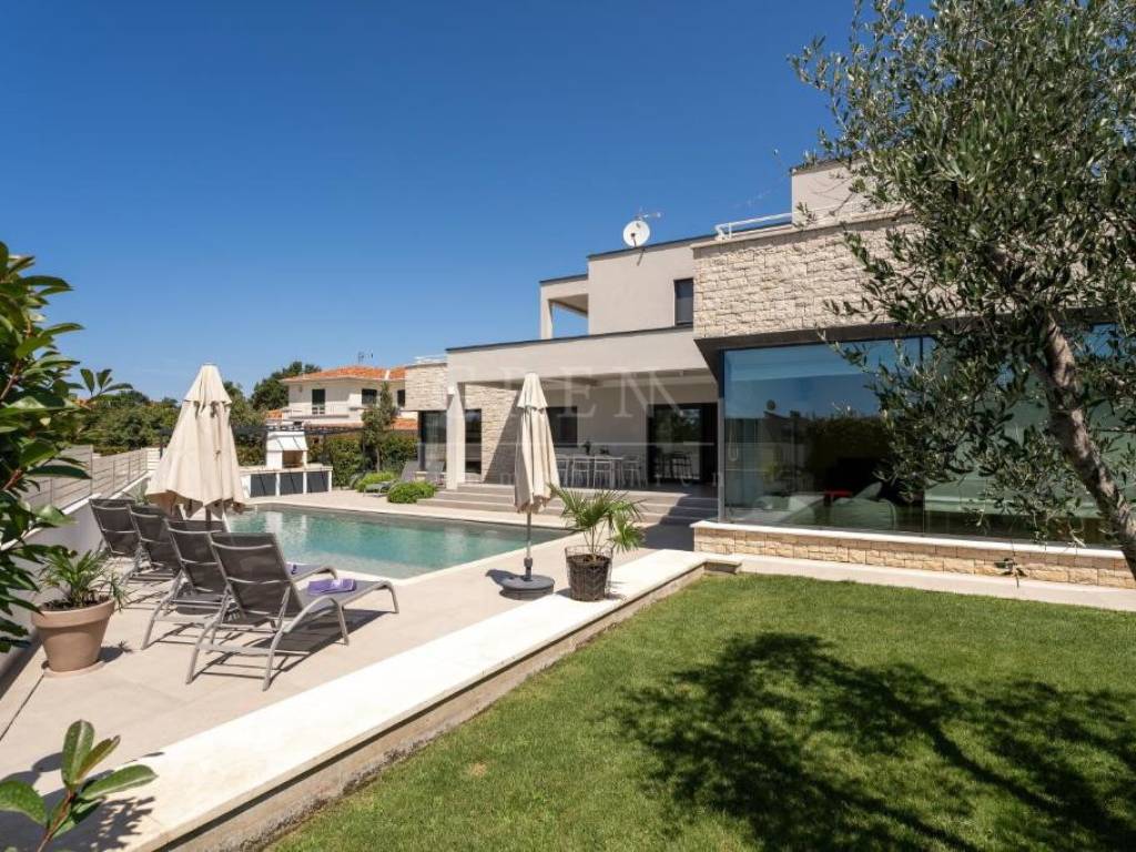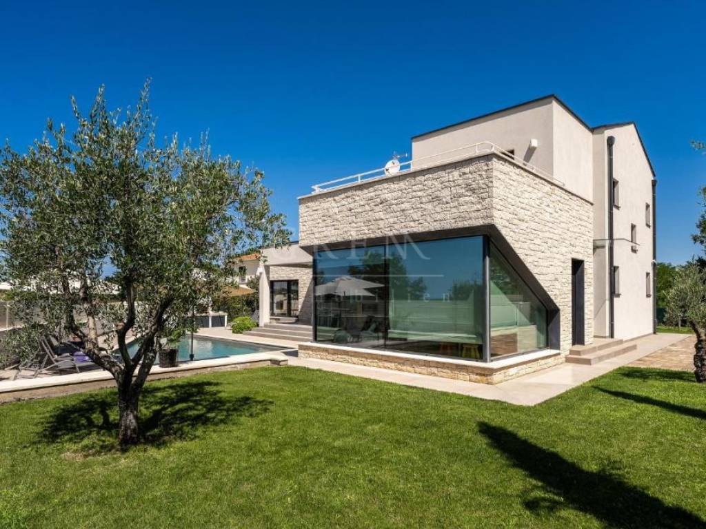 Ova prekrasna i moderna vila s pogledom na more smještena je na uzvisini na jednom brežuljku u neposrednoj blizini Poreča. Moderna arhitektura i suvremeni dizajn čine ovu vilu idealnom za život, ali i za najam. Kuća je otvorenog tlocrta, u prizemlju se nalazi moderna i dobro opremljena kuhinja u kojoj možete zadiviti obitelj i prijatelje pripremom ukusnih jela, tu je i blagovaonica i dnevni boravak u kojem se možete opustiti nakon napornog dana. Također, tu je i jedna prostrana spavaća soba s en-suite kupaonicom, gostinjski WC, ali i prostorija koja je trenutno namijenjena za prostor za dječju igru, kao i dvije ostave. Na katu kuće nalaze se tri spavaće sobe od kojih jedna ima garderobu; walk in ormar. Na katu se nalaze i dvije kupaonice, jedna s tušem, a druga s ležećom kadom. Svaka prostorija u kući opremljena klima uređajima. Kuća je spojena na gradski plin te ima centralno podno grijanje svih prostorija a u kupaonama su dodani i kupaonski radijatori. Kuća ima na krovu solarne panele za pripremu sanitarne vode. Svi prozori i balkonska vrata imaju električne rolete, dok balkonska vrata u dnevnom boravku imaju žaluzine. U dvorištu kuće nalazi se veliki bazen, natkrivena terasa i dječje igralište