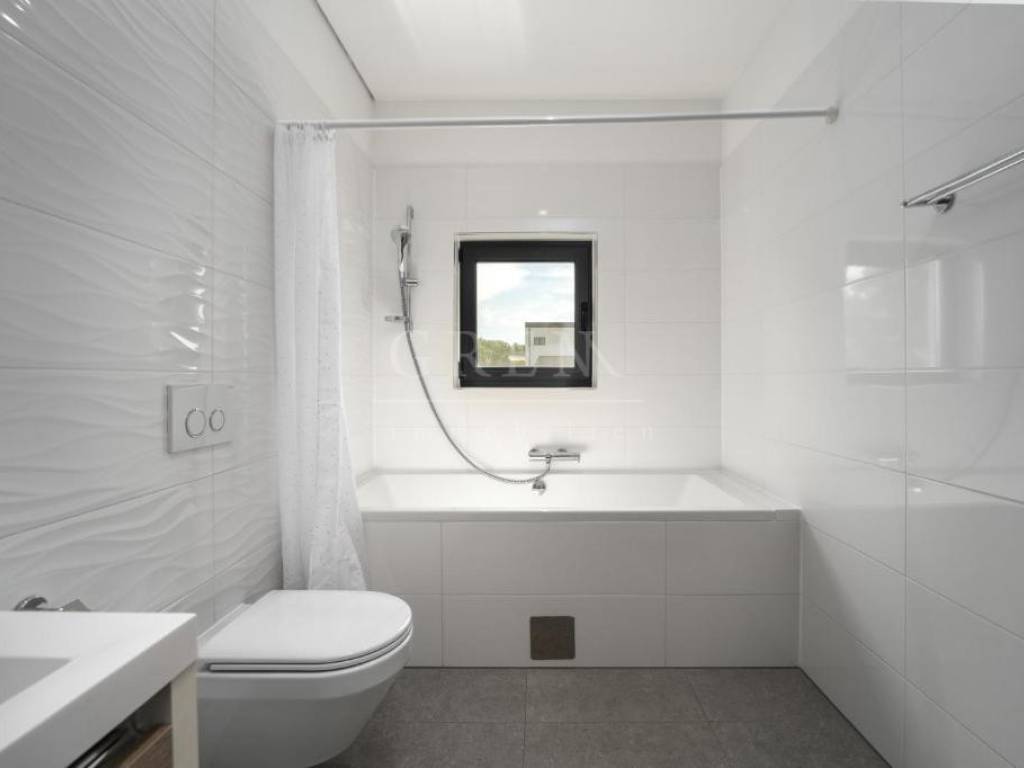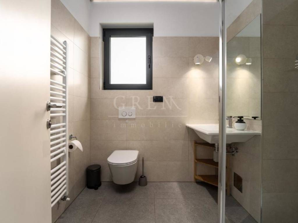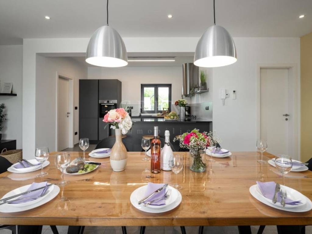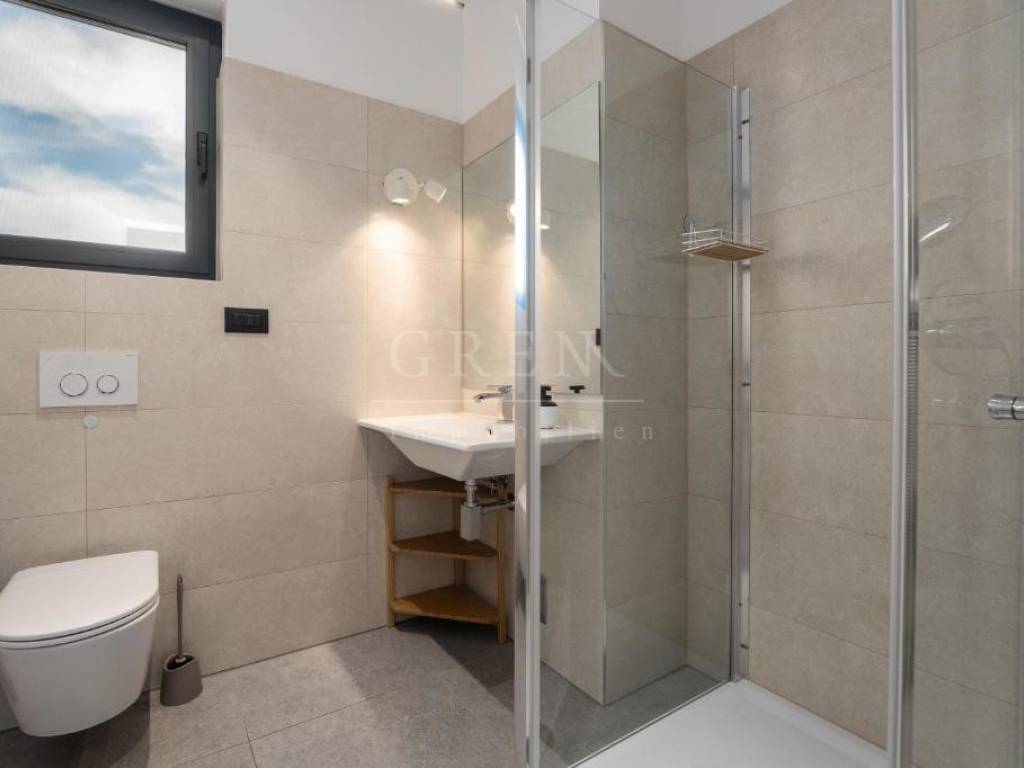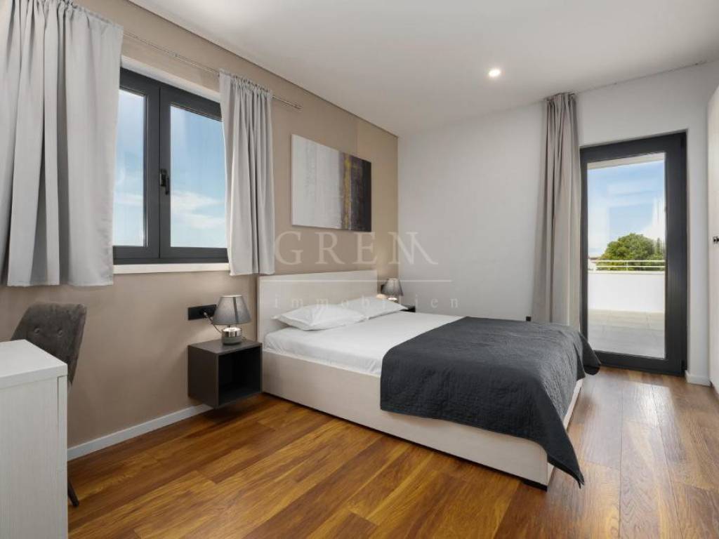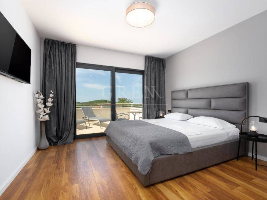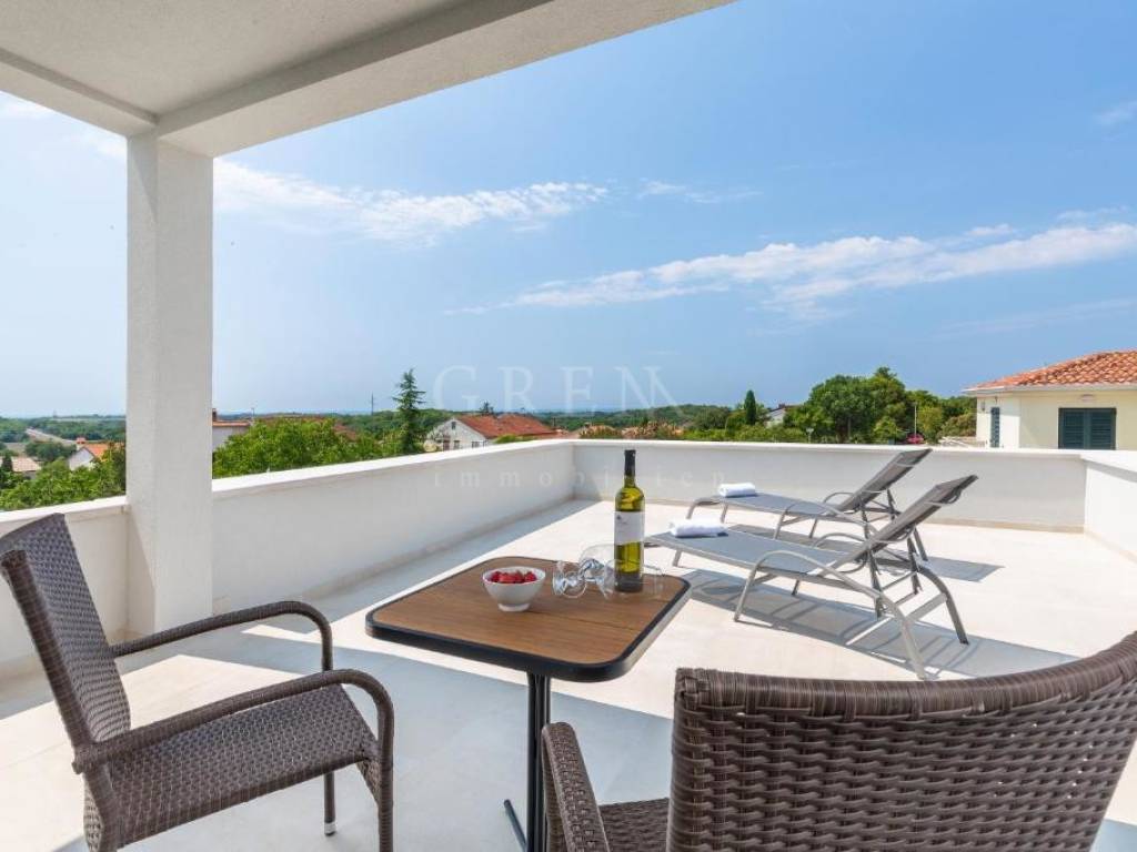 Ova prekrasna i moderna vila s pogledom na more smještena je na uzvisini na jednom brežuljku u neposrednoj blizini Poreča. Moderna arhitektura i suvremeni dizajn čine ovu vilu idealnom za život, ali i za najam. Kuća je otvorenog tlocrta, u prizemlju se nalazi moderna i dobro opremljena kuhinja u kojoj možete zadiviti obitelj i prijatelje pripremom ukusnih jela, tu je i blagovaonica i dnevni boravak u kojem se možete opustiti nakon napornog dana. Također, tu je i jedna prostrana spavaća soba s en-suite kupaonicom, gostinjski WC, ali i prostorija koja je trenutno namijenjena za prostor za dječju igru, kao i dvije ostave. Na katu kuće nalaze se tri spavaće sobe od kojih jedna ima garderobu; walk in ormar. Na katu se nalaze i dvije kupaonice, jedna s tušem, a druga s ležećom kadom. Svaka prostorija u kući opremljena klima uređajima. Kuća je spojena na gradski plin te ima centralno podno grijanje svih prostorija a u kupaonama su dodani i kupaonski radijatori. Kuća ima na krovu solarne panele za pripremu sanitarne vode. Svi prozori i balkonska vrata imaju električne rolete, dok balkonska vrata u dnevnom boravku imaju žaluzine. U dvorištu kuće nalazi se veliki bazen, natkrivena terasa i dječje igralište