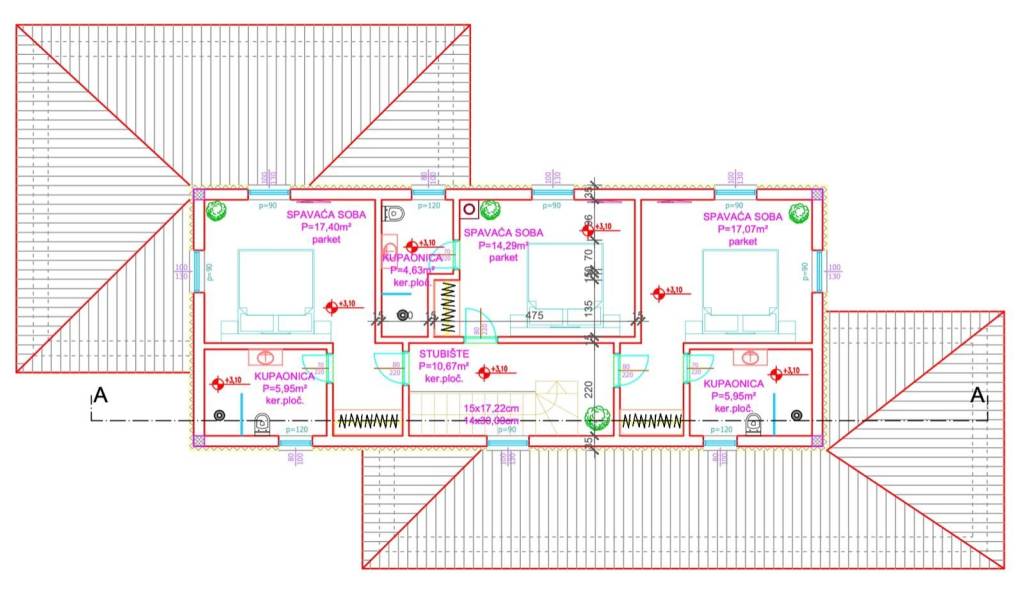 Na katu Vile nalaze se tri prostrane spavaće sobe (17.40 m², 14.29 m² i 17.07 m²) s pripadajućim kupaonicama što osigurava potpunu privatnost.