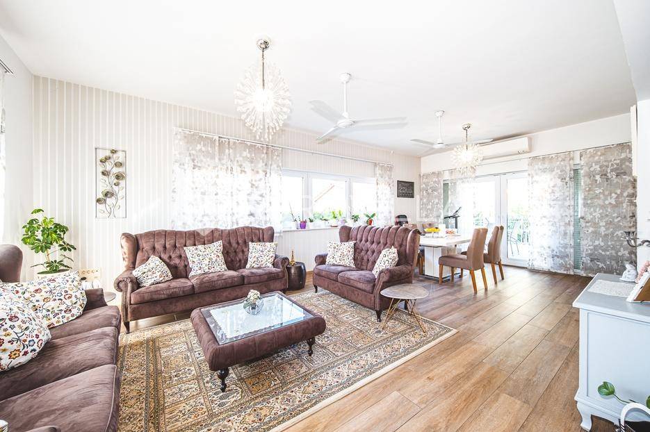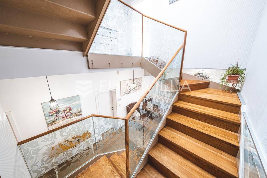 1. kat: hodnik, master spavaća soba 24 m2 sa vlastitom kupaonicom, 2 manje spavaće sobe (17 i 16 m2) s dijeljenom kupaonicom i velika terasa 55 m2.