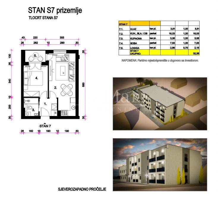 Stan S7 u prizemlju, ukupe neto površine 32,38 m2 sastoji se od ulaza, kuhinje, blagovaone i dnevnog boravka, kupaonice, jedne spavaće sobe te loggie.