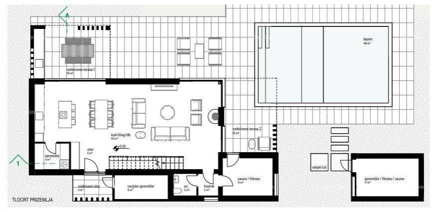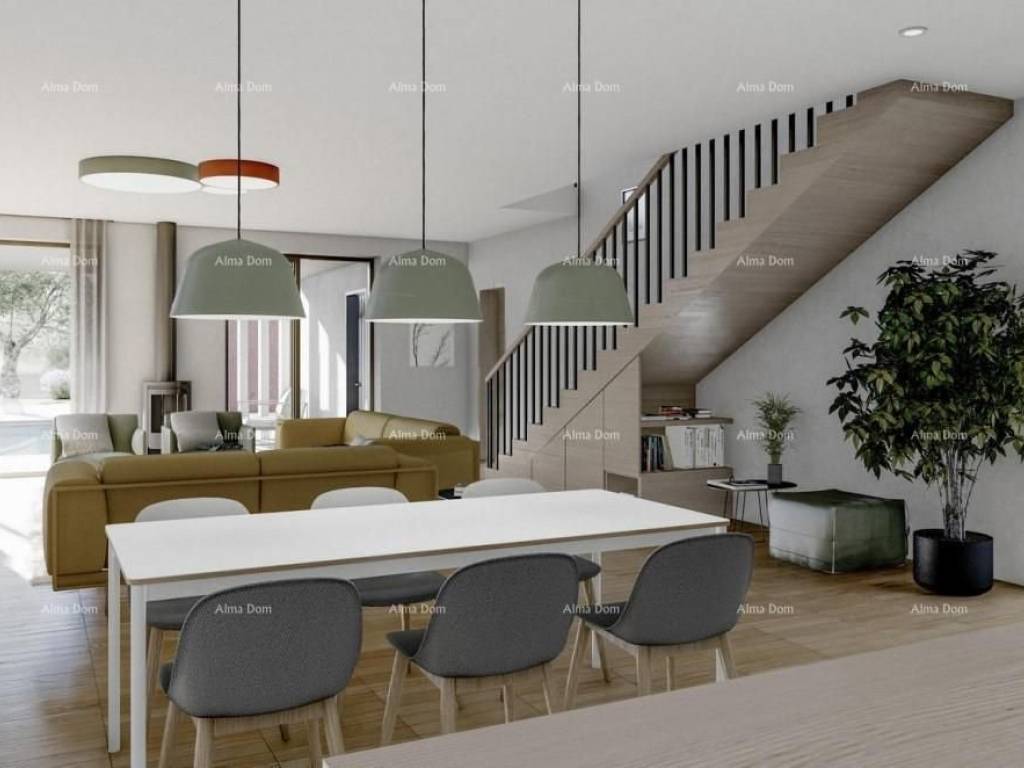 We are selling detached villas with a swimming pool in a new residential project near Labin.The project consists of 5 luxurious villas, each comprising a ground floor and an upper floor.The ground floor features a modern living area with an open-space concept including a kitchen, dining area, and living room, enhancing harmony and functionality. The ground floor also includes storage rooms (indoor and outdoor), a sauna/fitness room, and access to two covered terraces. The outdoor space, in addition to the covered terraces and storage in the auxiliary building, includes a pool with a total water area of 48 m², divided into a shallow children"s section and a deeper section.The upper floor consists of a hallway and 4 bedrooms, each with an en-suite bathroom.The bedrooms are oriented to the northwest, and one of them has access to a rooftop terrace of 17 m².The internal net area of House D is 176 m².The villas are designed with inverter air conditioning systems for temperature control, underfloor heating with a fan-coil system for added comfort, and the added benefit of solar panel installations to reduce energy consumption.The villas are currently in the early stages of construction, offering the opportunity to choose final materials in agreement.The proximity to all necessary amenities, such as shops, schools, a post office, health center, sports facilities, and restaurants, makes this location an excellent choice for those interested in tourist rentals, allowing for a faster return on investment.House D Total plot area: 2,365 m² Landscaped garden: 590 m², of which 460 m² are green areas and 130 m² are paved outdoor terraces Parking: 74 m² (two parking spaces)Completion date: June 2025For more information, please contact:Azra+385 91 611 5706+385 98 420 885azra@almadominvest.com
