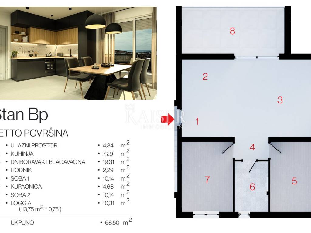 Kaiser Immobilien presents: Spacious two-bedroom apartment with loggia and sea view, Rogoznica In the heart of Dalmatia, in the picturesque and increasingly sought-after town of Rogoznica, is this beautiful, modern two-bedroom apartment. As part of a new residential complex, just 400 meters from the sea, this property offers the perfect blend of functional design, high-quality materials and a beautiful view, making it an ideal opportunity for family life, vacation or as a top investment. ABOUT THE PROPERTY: The apartment has been carefully designed to maximize space and emphasize an open and bright ambiance. With a total gross area of 68.50 m², it offers everything needed for a comfortable stay for a larger family or group. APARTMENT LAYOUT: Entrance area / Hallway: 4.34 m² Kitchen: 7.29 m² Living room and Dining room: 19.31 m² Hallway (sleeping area): 2.29 m² Bedroom 1: 10.14 m² Bathroom: 4.68 m² Bedroom 2: 10.14 m² Loggia: 10.31 m² The layout emphasizes the "open-space" concept, connecting the kitchen, dining room and living room, while ensuring privacy with two separate bedrooms and a spacious loggia for outdoor relaxation. KEY FEATURES AND BENEFITS: New construction in Rogoznica: Be the first owner of an apartment in a new, modern building with a sea view. Private loggia (10.31 m²): Spacious loggia with access from the living room, ideal for enjoying the view and fresh air. High-quality materials: High-quality materials are used in the construction and furnishing, ensuring durability and value. Functional layout: Ideal for a family, vacation or as a highly profitable investment for tourist rental. Customization: Buyers are offered flexibility and the ability to choose certain finishing materials during construction. Parking: Secured parking space. LOCATION: Rogoznica is one of the most beautiful and protected bays on the Adriatic, known for its crystal clear sea, beautiful beaches and the famous Marina Frapa. The proximity of Split, Šibenik and the airport makes it an extremely accessible and sought-after destination. Do not miss the opportunity to become the owner of this beautiful property in one of the most attractive locations on the Dalmatian coast! The agency commission for the buyer is 3% + VAT and is paid in the case of purchasing a property, upon conclusion of the first legal act. Viewing the property is possible only with the prior signing of a real estate brokerage contract. If you would like to visit the property in person, please contact: Joško Bašić E-mail: josko@kaiser-immobilien.hr Tel: +385-91-511-2993 http://kaiser-immobilien.hr/