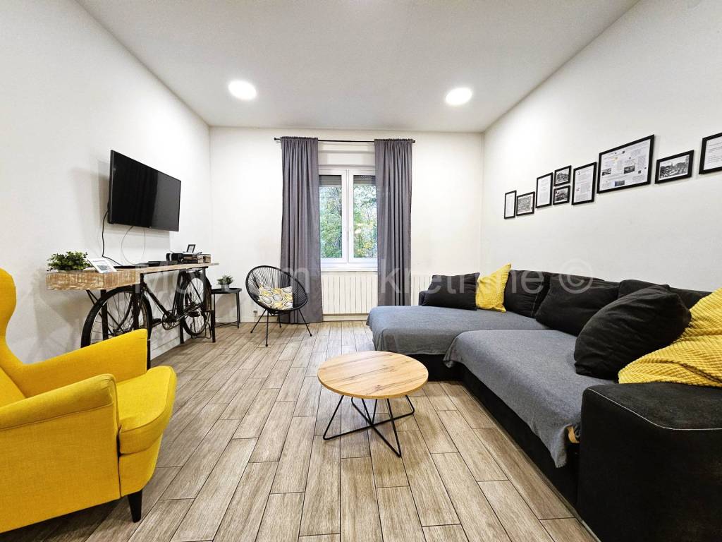 Prodaje se uređen 3soban stan s balkonom u visokom prizemlju zgrade. U je kompletno uređen 2018.godine kada su uređeni podovi, stavljena PVC stolarija, protuprovalna vrata te su promijenjene sve instalacije u stanu (voda, struja, plin). Stan je opremljen klima uređajima. Prodaje se kompletno namješten. Pripada mu spremište u podrumu zgrade. Zgrada je građena 1938.godine i nalazi se u blizini nekoliko osnovnih i srednjih škola, nekoliko vrtića, bolnice i tramvaja. Udaljen je par minuta pješice od Trga bana Jelačića. Stan je trenutno podijeljen u dvije stambene jedinice (apartmana) koje se koriste u svrhu dnevnog najma. Zgrada je poslije potresa dobila zelenu naljepnicu.