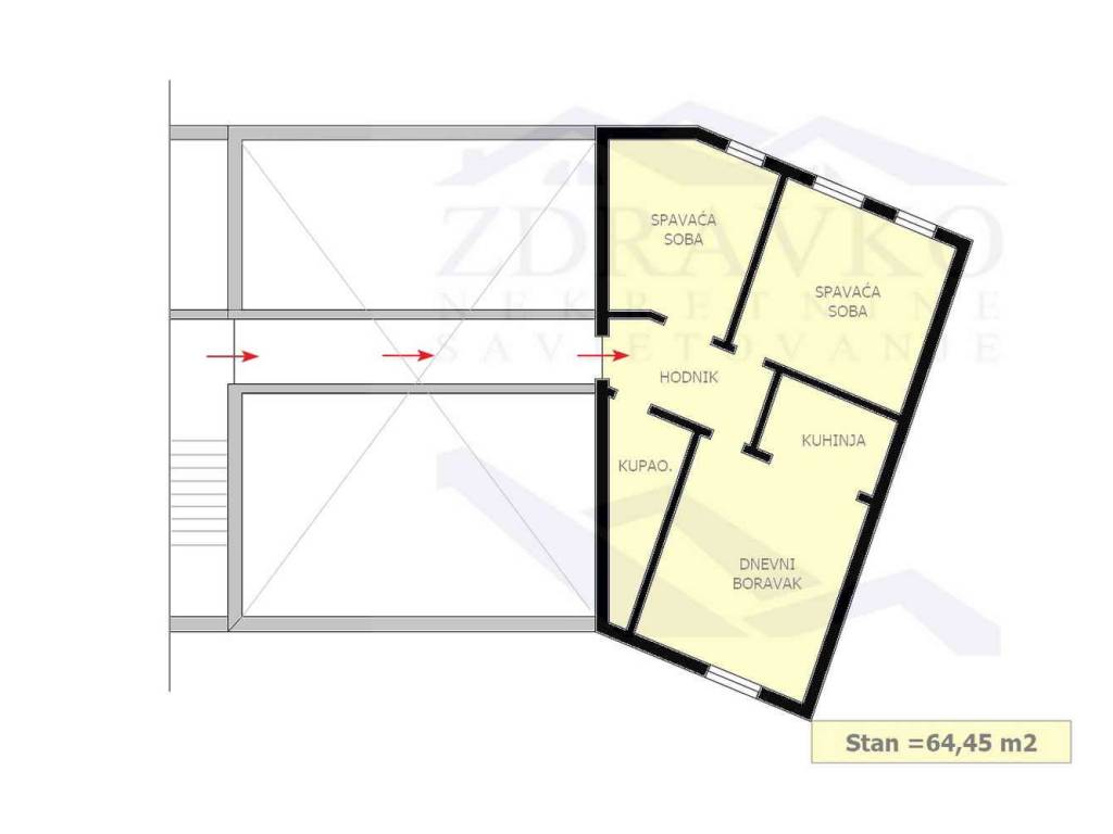 Površina stan =64,45 m2 (hodnik, dvije spavaće sobe, boravak, kuhinja, kupaonica.