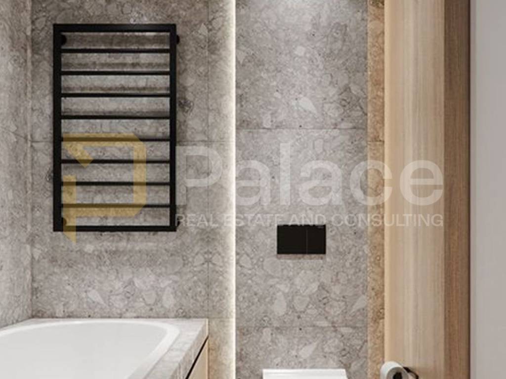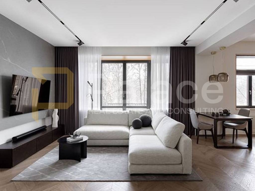 The apartment consists of three spacious bedrooms, three bathrooms, a dressing room and a hallway, balcony, living room, dining room, and kitchen connected in a shared open concept, as well as a large terrace.