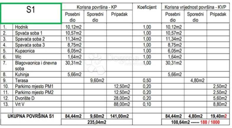 In a quiet street in Stupnik, apartment S1 is for sale on the ground floor of a small residential building. The apartment offers 84.44 m2 of interior space, a 9.60 m2 terrace and a private courtyard with a garden. The layout includes three bedrooms, a bathroom, an additional toilet, a kitchen and a spacious dining and living room. The price includes two parking spaces. The project offers a modern construction standard and excellent functionality for family life or a long-term investment. The start of construction is planned for January 2026, and completion is planned for December 2026.