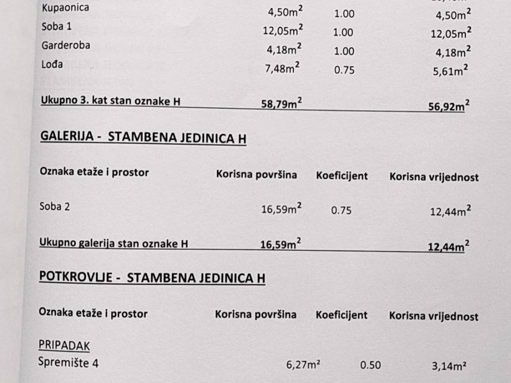 Stan H 3. kat stambena površina 63,75 m2 (2 spavaće sobe + kupaonica) + lođa (7,48 m2) + spremište4 (6,27 m2) + vanjska parkirno mjesto PM7 (3,90 m2); neto obračunske površine 76,40 m2 = 218.351 EUR