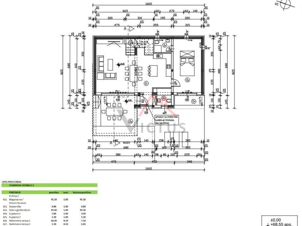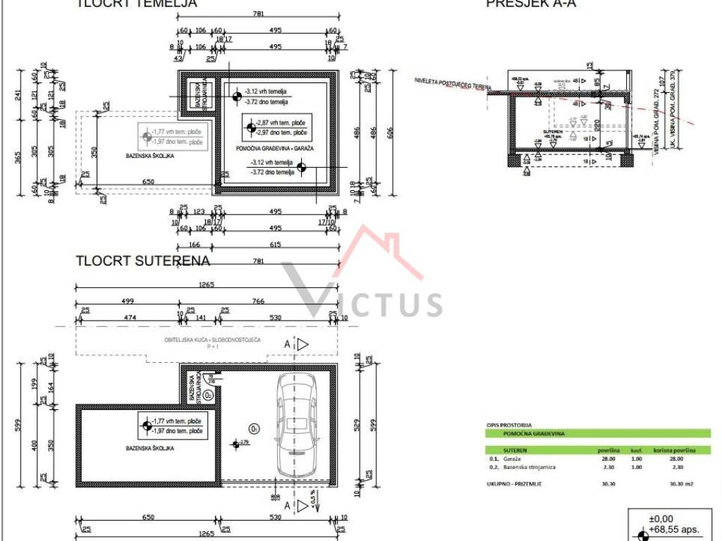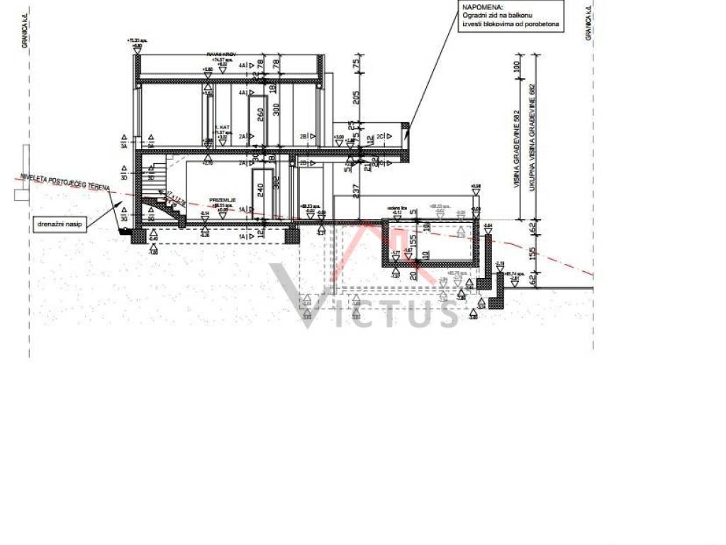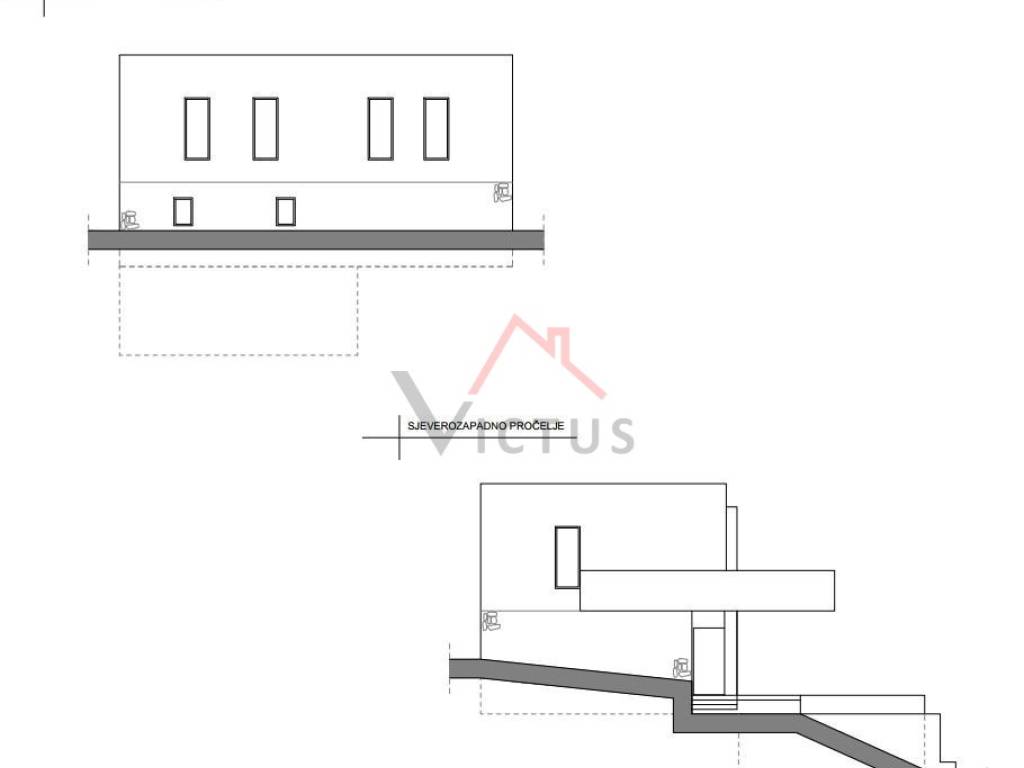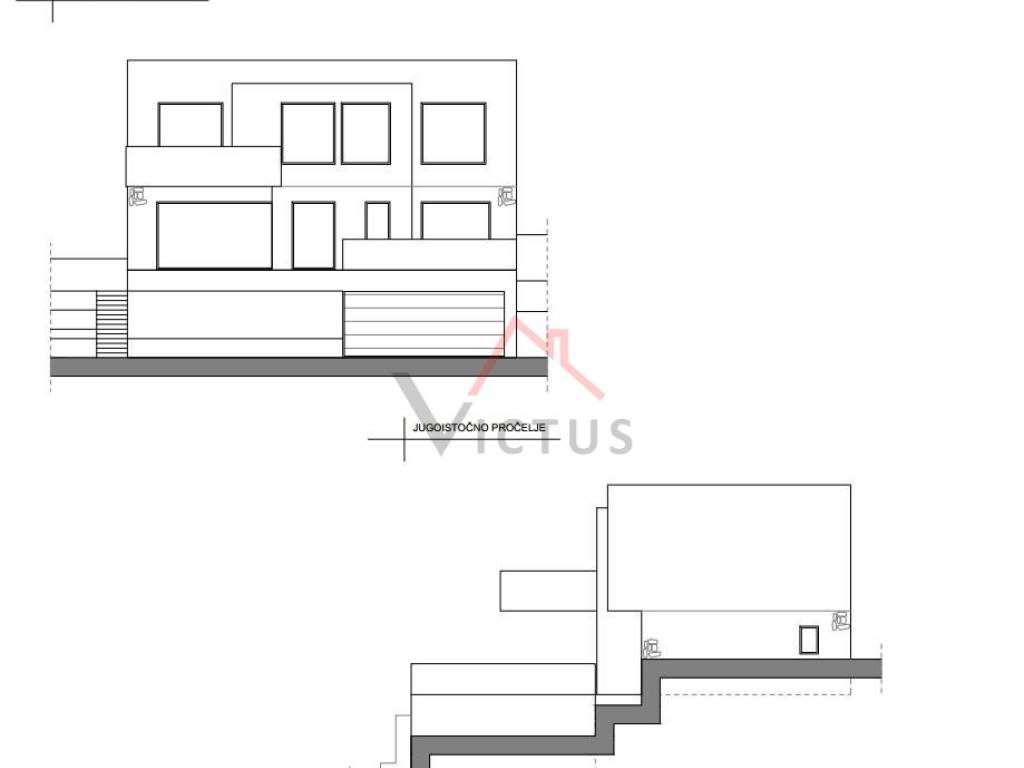 Zemljište površine 486 m2 se prodaje s projektom za samostojeću vilu na tri etaže s bazenom i krovnom terasom, te za koju je predan zahtjev za izdavanje građevinske dozvole. U cijenu ulazi zemljište van građevinske zone površine 298 m2, a koje je povezano s zemljištem građevinske namjene. Vila je neto stambene površine 218 m2, sa 5 spavaćih soba, svaka s vlasitom kupaonicom. Do zemljišta vodi asfaltirani prilaz. Prema projektu, raspored vile je sljedeći: