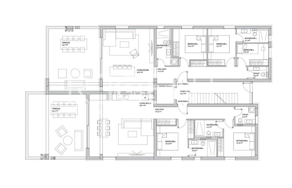 In the charming and quiet neighborhood of Diklo in Zadar, known for its beautiful beaches and relaxed Mediterranean lifestyle, lies a luxurious residential new building that offers a top-quality living standard. This modern building consists of six spacious apartments. On the 1st floor of the building there is a luxurious three-room apartment with a total NKP of 120.87 m2. The apartment consists of: hallway (10.39 m2), living room with kitchen and dining room (38.16 m2), bedroom 1 (10.89 m2), bedroom 2 (10.86 m2), bathroom 1 (4.46 m2), bathroom 2 (4.45 m2), toilet/laundry room (3.32 m2), loggia (18.14 m2), covered terrace (3.52 m2), storage room (2.93 m2). The apartment includes two garage parking spaces (13.76 m2). The apartments are equipped with the most modern equipment and materials. The building uses a heat pump for underfloor heating, while high-quality Mitsubishi equipment is in charge of air conditioning. The floors are covered with ceramic and parquet flooring of the highest quality and large dimensions, and Schuco carpentry ensures top insulation and aesthetics. For additional luxury, the building offers Jacuzzis on the roof terraces, an outdoor pool and an underground garage. This new building is located in an extraordinary location, close to all essential amenities. In just a few minutes walk you can enjoy the beaches, while restaurants, cafes and other facilities are within easy reach. At the same time, the strict center of Zadar is only a 10-minute drive away, which makes this property ideal for those looking for a peaceful oasis with easily accessible urban amenities.