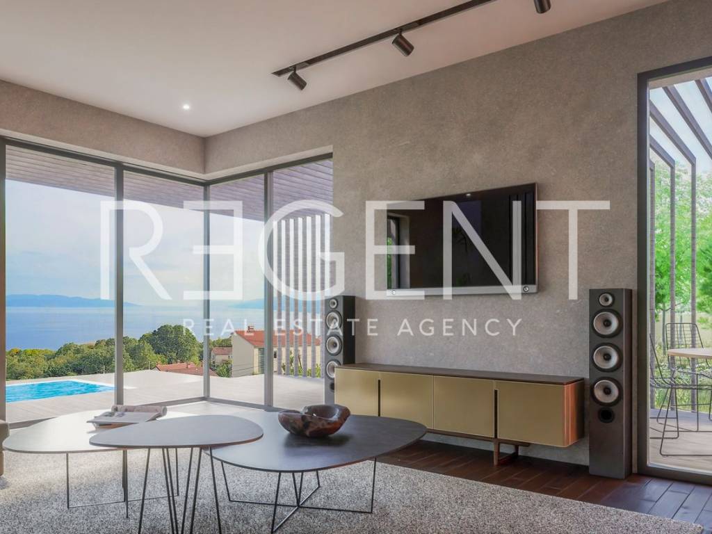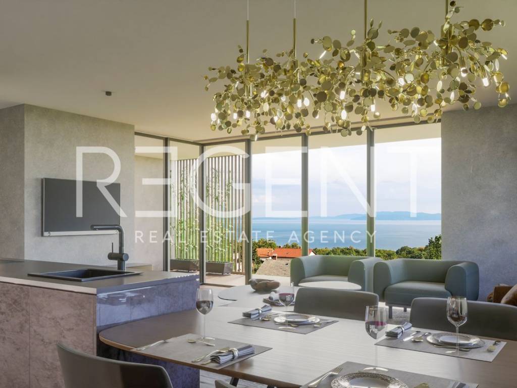 In a quiet neighborhood, in an ideal location between Opatija and Rijeka, lies a luxury two-story apartment that offers superior comfort and modern design. This elegant property is located on the ground floor of an exclusive residential complex and covers a total area of 166 m². The apartment consists of two floors, with the ground floor designed as an open living space that connects a spacious living room, dining room and a modern equipped kitchen. A large corner glass wall with a lift-and-slide opening system provides seamless connection of the interior with the outdoor terrace, creating a unique whole for enjoyment and relaxation. On this floor there is also a guest toilet, laundry room and storage room. The exterior of the apartment offers a covered terrace of 52 m² with a pergola, a sun deck covered with decking and a swimming pool, making this space perfect for spending time outdoors. The terrace includes space for an outdoor shower, grill, dining table and lounge set. An elegantly designed staircase leads to the first floor where there are three bedrooms, including a spacious master bedroom with its own bathroom and balcony. There is also an additional bathroom on this floor, ensuring a high level of comfort for all tenants. The total area of the closed space is 129 m², while with the terrace and associated outdoor spaces it reaches 166 m². The apartment is equipped with a modern heating and cooling system via a heat pump, with underfloor heating in all rooms and ceiling and wall fan coil units for optimal temperature throughout the year.Additional amenities include its own video surveillance, video intercom and two parking spaces. This property stands out for its excellent location, close to all essential amenities and only ten minutes drive to Opatija and fifteen minutes to the center of Rijeka. For any additional information and to arrange a viewing, please feel free to contact us!