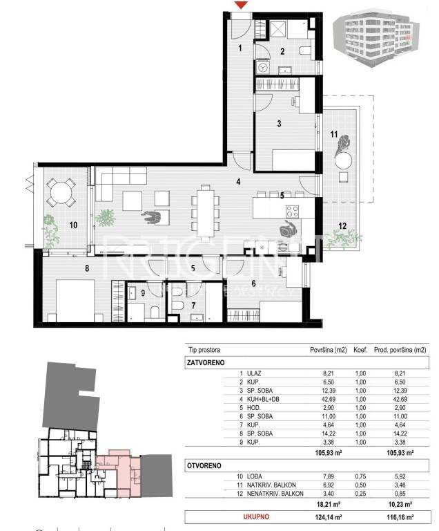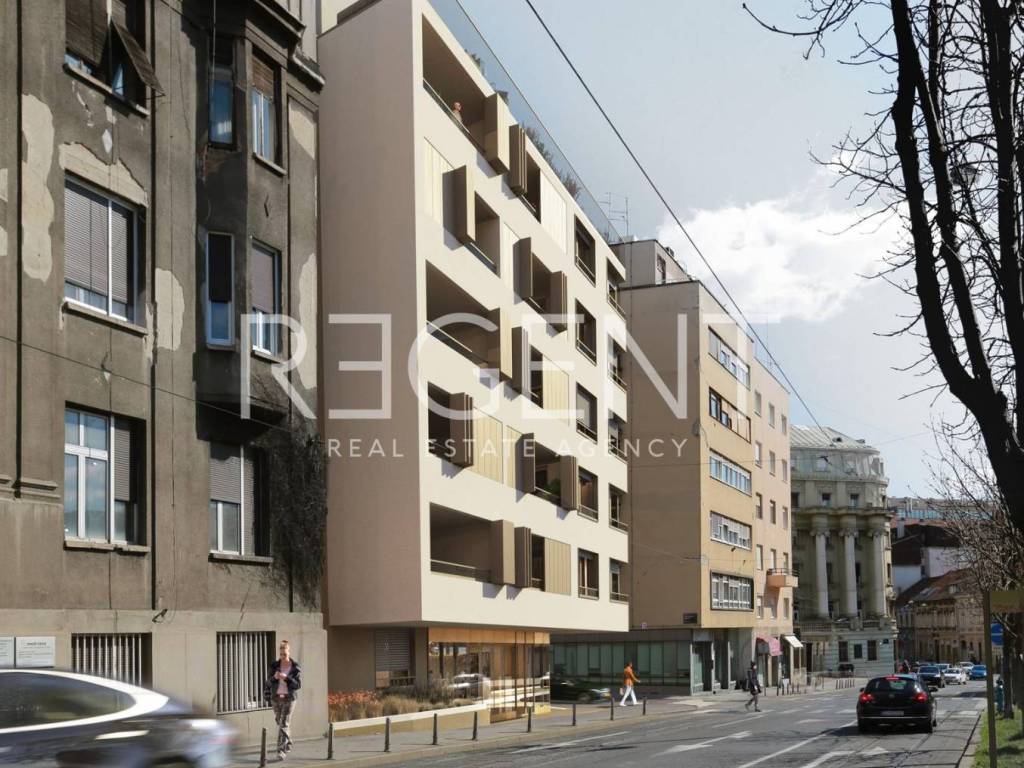 Top-quality residential new construction with a panoramic view of the Zagreb Cathedral is located in the most attractive location in the city of Zagreb, in Novakova Street. Located at the beginning of Ribnjak, it is only a three-minute walk from Ban Josip Jelačić Square. On the 2nd floor of the residential new building there is a luxury four-room apartment with a total living area of 116.16 m2. It consists of: entrance (8.21 m2), bathroom 1 (6.50 m2), bedroom 1 (12.39 m2), kitchen + living room + dining room (42.69 m2), hallway (2.90 m2), bedroom 2 (11 m2), bathroom 2 (4.64 m2), bedroom 3 (14.22 m2), bathroom 3 (3.38 m2), loggia (5.92 m2), covered balcony (3.46 m2), uncovered balcony (0.85 m2). Total NKP 116.16 m2. The building consists of 3 underground floors, a ground floor and 6 floors, a total of 21 residential units. Each apartment has an assigned storage room and parking space in the garage. The building is south-facing, which allows optimal use of solar energy. The quality of construction is extremely high, with an emphasis on modern and functional solutions: Two elevators facilitate access to each floor. Heat pump – underfloor heating. All rooms are air conditioned. External carpentry is equipped with electric blinds and aluminum shutters. The railings on the loggias are glass, providing an open and airy space. Staircases are covered with large-format ceramics, and railings are made of plastic-coated steel. Preparation for video surveillance and burglar-proof doors ensure the safety of tenants. Smart home system. Oak parquet class I and gres ceramics class I. Sanitary ware is of a high standard. A ventilated facade on the street side and a STO facade on the courtyard side ensure energy efficiency. The ceiling height of 265 cm further contributes to the feeling of spaciousness. In the garage there is an option to install a charger for electric cars. Location: The most attractive location, close to all essential amenities: shops, schools, kindergartens, public transport. Completion of construction and moving in are planned for December 2025.
