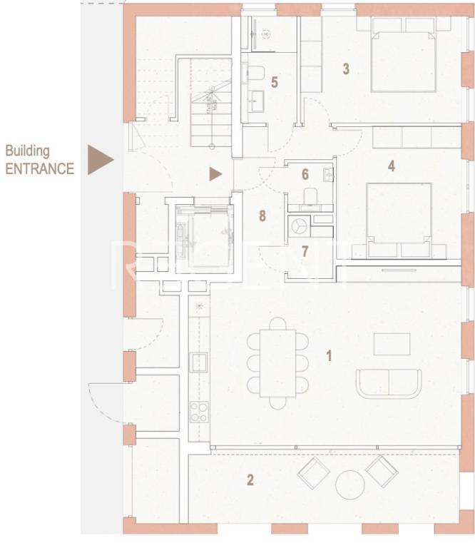 Apartment S1 is ideal for family life, vacation or investment – with a private garden, southern orientation and a peaceful location near Trogir. Located on the ground floor of one of five buildings within a modern residential complex in Seget Donji, apartment S1 offers everything a modern buyer seeks – functionality, private outdoor space and proximity to the sea. The living area opens onto a covered loggia that leads to a spacious garden, creating a seamless transition from the indoor to the outdoor living space. Location The apartment is located in Seget Donji, in the Split-Dalmatia County, in a quiet and well-connected location. Shops, the city beach (800 m), marina, school, kindergarten and all daily amenities are within walking distance. The historic center of Trogir can be reached with a pleasant 20-minute walk. Project Description The apartment is part of a multi-story building with a total of five floors (ground floor + 4 floors). The building has an elevator, a private entrance and a secured outdoor parking space. The project is characterized by an airy layout of the buildings, green areas and views of the sea and nature. High-quality construction and three-sided orientation of the apartments guarantee comfort and lasting value. Apartment S1 contains: Living room with kitchen and dining room – 35.26 m² Bedroom 1 – 13.13 m² Bedroom 2 – 12.56 m² Bathroom – 4.27 m² Additional WC – 1.69 m² Laundry room – 2.00 m² Hallway – 6.16 m² Covered loggia – 15.28 m² Private garden – 185 m² Total net area: 90 m² Equipment and technical characteristics Ceiling height: 285 cm Three-sided orientation PVC joinery Floor coverings: PVC laminate and ceramic tiles Energy efficient construction Elevator in the building Outdoor parking included Accessibility for people with disabilities Completion date and move-in Start of construction: September 2025. Completion of works: end of 2026. Move-in: after obtaining a usage permit