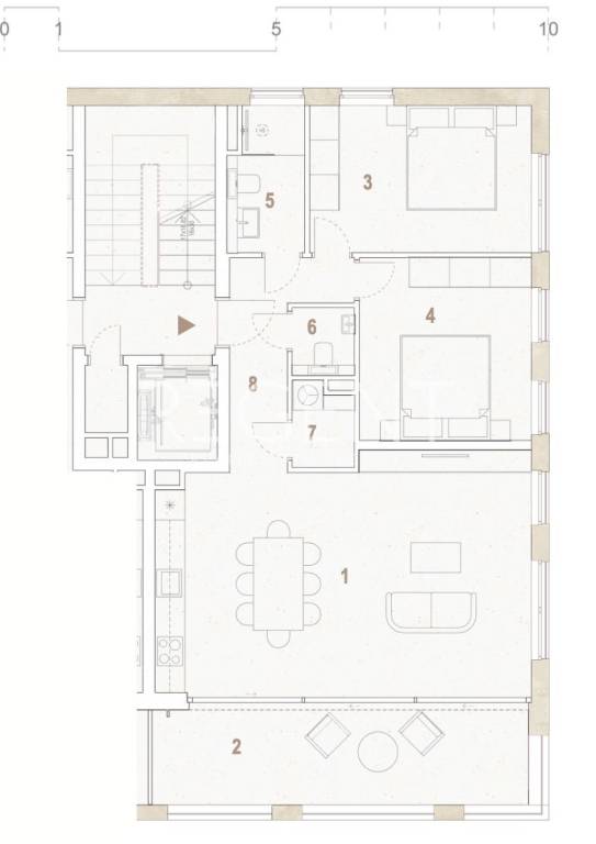 Apartment S5 provides the ideal combination of functionality, light, and views – perfect for family life, vacation, or rental. Located on the second floor of one of the five buildings of a modern residential complex in Seget Donji, apartment S5 offers a carefully designed layout, a spacious loggia with a south orientation, and a view towards Trogir Bay and Čiovo Island. The three-sided orientation ensures an abundance of natural light throughout the day. Location The apartment is located in Seget Donji, in Split-Dalmatia County, in a quiet and well-connected location. Shops, a school, a kindergarten, a marina, and the city beach (800 m) are in close proximity. The historical center of Trogir can be reached with a leisurely walk in about 20 minutes. Project Description The apartment is part of a multi-story building with a total of five floors (ground floor + 4 floors). The building has an elevator, outdoor parking is provided, and the green surroundings further enhance the quality of living. The project has been carefully planned to ensure privacy, functionality, and an attractive view. Rooms of Apartment S5 Living room with kitchen and dining area – 35.25 m² Bedroom 1 – 13.13 m² Bedroom 2 – 12.59 m² Bathroom – 4.27 m² Additional WC – 1.69 m² Laundry room – 2.00 m² Hallway – 6.16 m² Covered loggia – 15.40 m² Total net area: 90 m² Equipment and Technical Specifications Ceiling height: 270 cm Three-sided orientation PVC joinery Floor coverings: PVC laminate and ceramics Energy-efficient construction Elevator in the building Outdoor parking included Accessibility for people with disabilities Completion and Move-in Date Construction start: September 2025 Completion of works: end of 2026 Move-in: after obtaining a usage permit For more information, feel free to contact us.